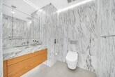 Enjoy breathtaking sunrise & sunset views from this flow-through corner residence at Monad Terrace, designed by Pritzker Prize winner Jean Nouvel. A private elevator opens into this three-bedroom, three-and-a-half-bath home in the sky, with floor-to-ceiling sliding glass doors and a fifteen-foot-deep wraparound terrace framing sweeping views of the Downtown Miami skyline, Biscayne Bay, & South Beach. The kitchen features Gaggenau appliances and Calacatta marble countertops, creating a striking setting for entertaining. The primary bathroom offers a steam shower and soaking tub with bay views. Monad Terrace is an architectural jewel of just 59 homes, surrounded by a central lagoon and lush climbing gardens. Bayfront pool, jacuzzi, & gym. Close to Sunset Harbour & South of Fifth.