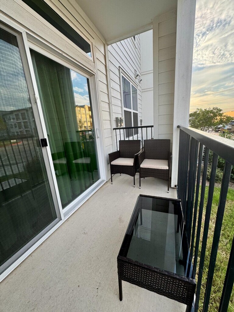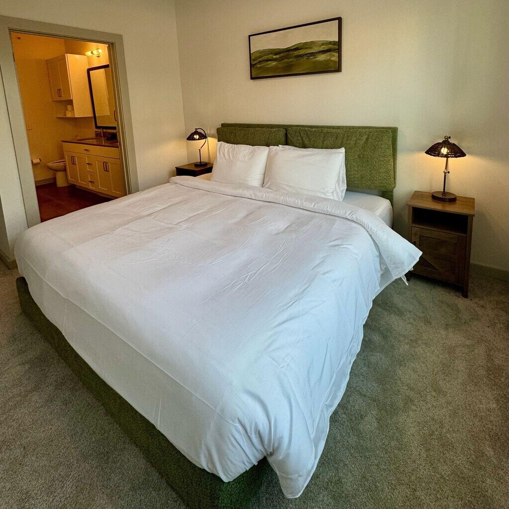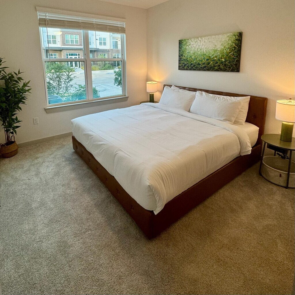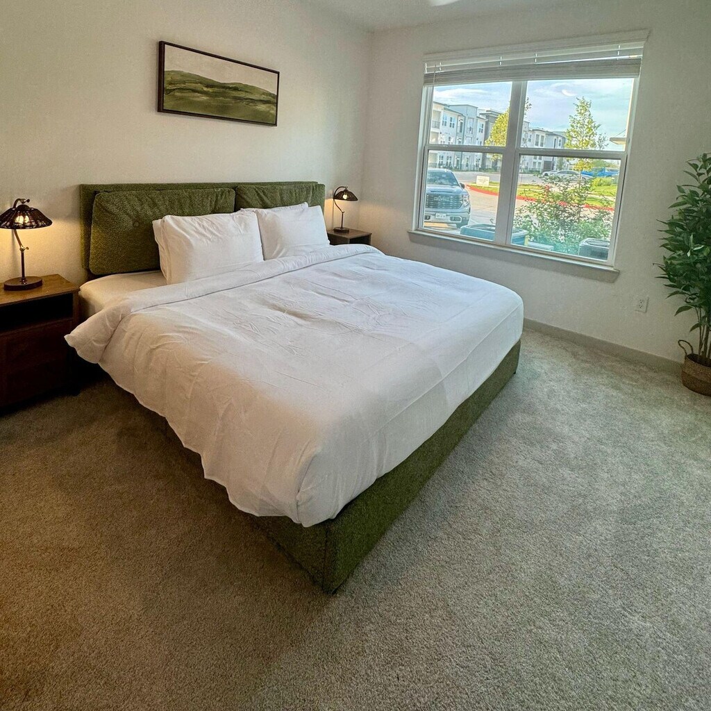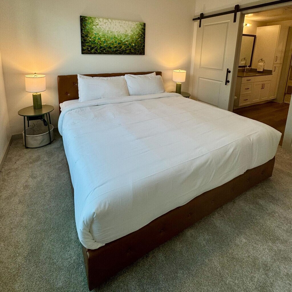 Feel at home in this bright and comfortable 2-bed, 2-bath apartment at The Merriman in San Marcos. This apartment features a spacious layout with wood flooring, modern lighting, a cozy living area, a smart TV, and a private balcony. The kitchen includes stainless appliances, quartz counters, and an island. The bedrooms offer king-size beds and ample closets. Guests enjoy access to a resort-style pool, fitness center, coworking areas, lounges, and game room. Guests enjoy convenient access to nearby dining and shopping. [SI]