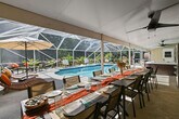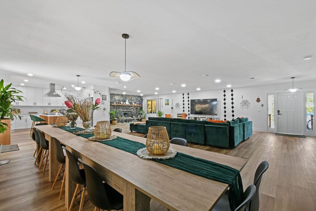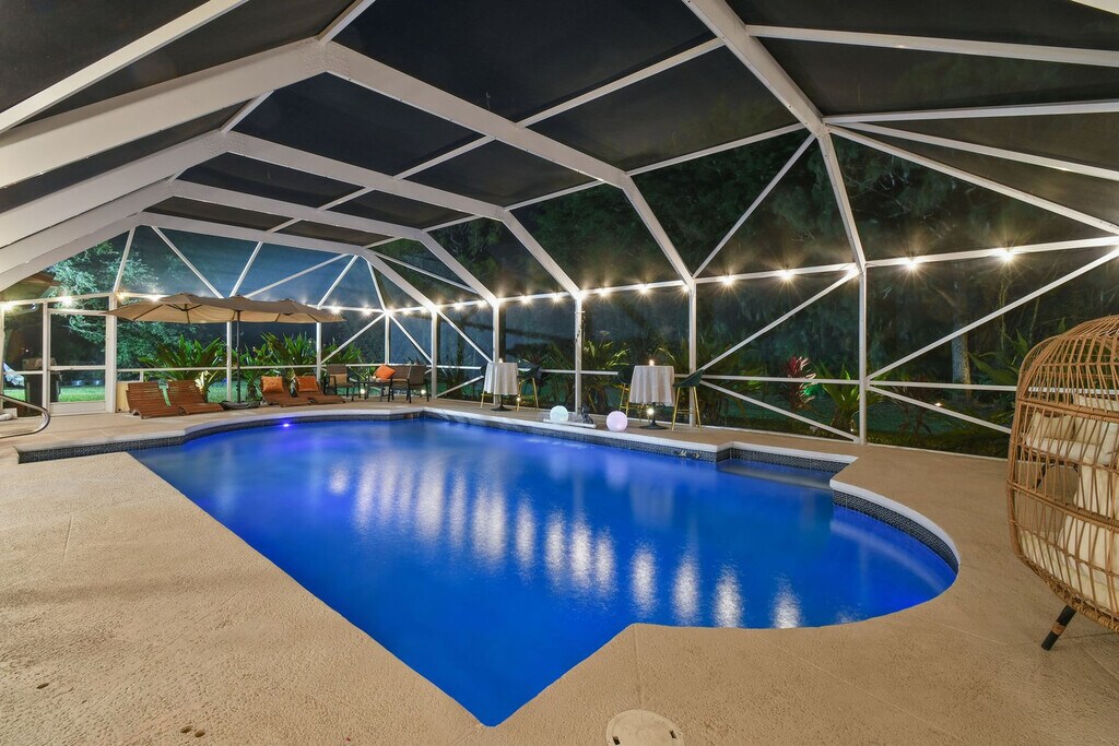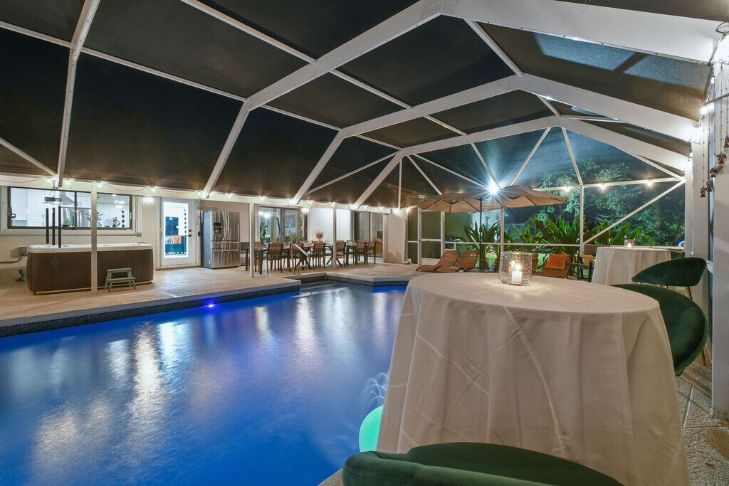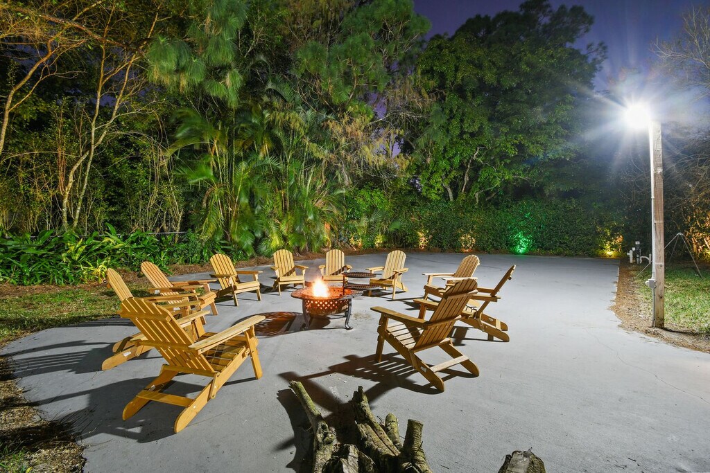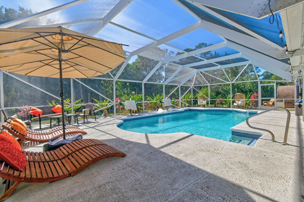Feel at home in the Green House, a spacious 5-bedroom, 3.5-bathroom retreat on 2 acres that sleeps 18. It's the ultimate spot for unforgettable events, relaxation, and fun, just 14 miles from PBI airport. This expansive 3400 sq ft home is designed for comfort and entertainment. Cook in the fully equipped kitchen, relax in the roomy living area with an 85-inch smart TV, and enjoy the heated screened-in pool, jacuzzi, sauna, fire pit, alfresco dining area, BBQ grill, and outdoor lounging areas. The living room offers a large sofa with seating for 10-12 guests, flameless candles, books, and puzzles. The dining room features a large wooden table that seats 16. The laundry room has a large capacity washer and dryer with detergents and cleaning products. RV parking is available upon request. Up to 2 pets are allowed (no cats) with a non-refundable $150 pet fee. Early arrivals or late departures depend on availability and come with a $50/hour fee. Conveniently located within 15 miles from the beach, downtown attractions, polo grounds, I-95, the Turnpike, and the airport, you'll find a variety of activities and sights within easy reach. Observe local wildlife like rabbits, iguanas, turtles, and birds. Outdoor music must be kept low and must end by 8:00 PM. Music or amplified sound should not be audible beyond the front gate. Smoking is strictly prohibited inside and will result in a $500 fine if violated. Guests are responsible for cleaning the BBQ gas grill and kitchen oven after each use and before check-out; if not cleaned to a satisfactory standard, a cleaning fee of $150 will be deducted. There is a minimum age requirement of 30 y/o to be able to book the property. Prior written authorization is required for any visitors not listed on the reservation as registered guests. After midnight, any additional person present will be considered an overnight guest unless previously approved. Pack-n-play, high chair, and kids' dinnerware are available. Registration Number: 000030464, [SI]