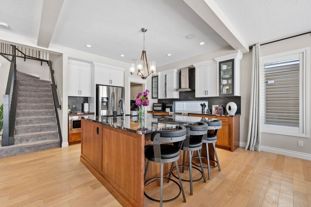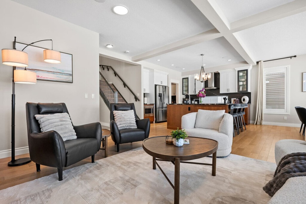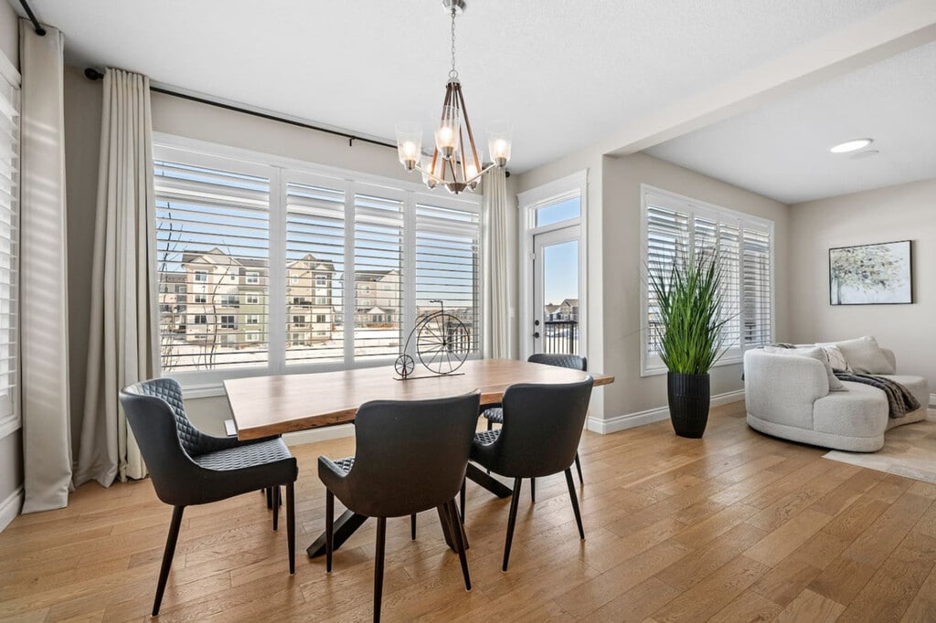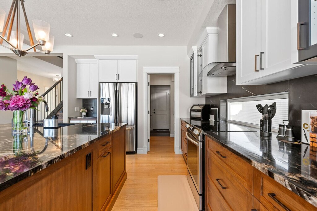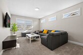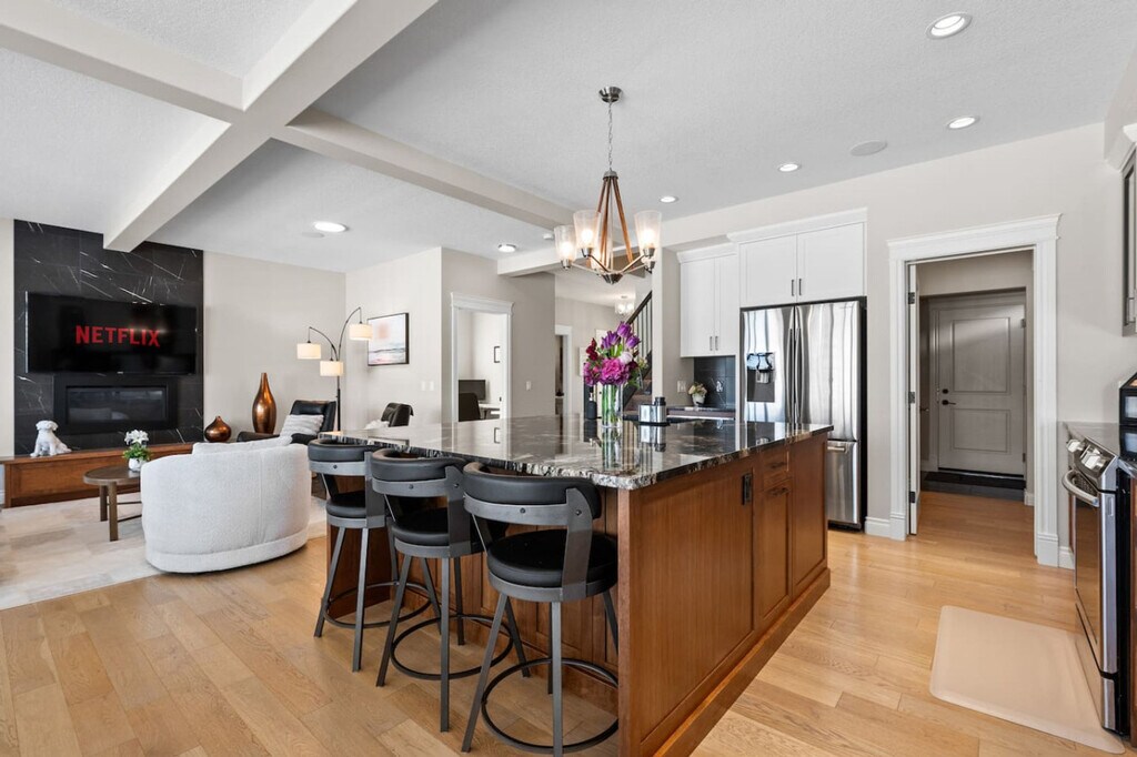The advertised rate of C$5,353/month is the lowest available price, based on a 1 month(s) stay with a move-in date of April 18, 2026. Rates vary depending on the duration of stay, season, and other parameters. For exact pricing and additional pricing components, please visit our website and enter your desired move-in and move-out dates. The rate is applicable when billed upfront; it can be higher if billed in multiple payments. Feel at home in this thoughtfully designed townhome in Airdrie, offering upscale finishes, spacious interiors, and breathtaking canal views. This property offers 3 full bathrooms and 1 half bathroom. This property features a full-size pool table, recliner movie seats, a twin over double bunk bed, a queen sofa bed, 2 double beds, and 2 queen beds. The kitchen and dining area include stainless steel and custom appliances, a 4-burner stove, oven, microwave, refrigerator, freezer, dishwasher with pods provided, coffee maker, toaster, and essentials. A large dining area is available on the main floor with island seating and bar stools. Complimentary paper towel, grinds, tea, and a Brita are provided. Enjoy the outdoor area with outdoor seating, a fire pit, and a BBQ grill. Additional features include a washer and dryer in-unit with detergent provided, a coffee machine, and cooking supplies. Enhance your stay with curated add-ons, designed to make your visit even more special: a National Park Entry Upgrade, Welcome Basket, Birthday Decor Package, Romantic Wine & Flower Package, Spa at Home Package, Movie Night Upgrade, Christmas Tree & Holiday Decor, Halloween Decor & Pumpkin Carving Package, Winter Cozy Package, Beer Tasting Kit, Diffuser & Aroma Set, Additional Bedding & Sleeping Arrangements, and Grocery Pre-Stocking Service. A 2-car garage, driveway, and street parking are available. Nestled in the sought-after Bayside community of Airdrie, this home offers a serene stay with convenient access to the very best of Airdrie, Calgary, and the Rockies. With shopping, parks, dining, and major routes just minutes away, you’re perfectly positioned for everything from local outings to mountain day trips. It is transit-friendly with Airdrie Transit providing convenient bus routes, including the Intercity Express (ICE) service to Calgary, making commuting easy. Located in Midtown Airdrie, this growing community features scenic walking paths, ponds, and green spaces. Enjoy Airdrie’s extensive pathway network, perfect for cycling and outdoor activities, with easy access to parks and nearby trails. It is located 7 min to Chinook Winds Regional Park, 8 min to No Frills & Walmart, 10 min to CrossIron Mills, 18 min to Calgary International Airport, 25 min to Calgary Zoo and TELUS Spark Science Centre, 30 min to SAIT and Downtown Calgary, 32 min to University of Calgary, 35 min to WinSport (Canada Olympic Park), 38 min to Heritage Park Historical Village, 45 min to Fish Creek Provincial Park, 50 min to Spruce Meadows, and 1 hr 20 min to Banff National Park. A $250 CAD fine will be charged if smoking occurs with the migration of smoke or smell of smoke. No shoes are allowed inside. Quiet hours are from 10 pm to 7 am, please be mindful of neighbors. There is a strict complaint policy. One complaint is a warning, the second complaint is an eviction. Keep noise under 85db, as there is a noise detector. Late check-out requests must be submitted at least 24 hours in advance for consideration. Unauthorized late check-outs will incur a fee of $50 for the first hour, followed by $35 for each additional 30 minutes. Includes a full office with monitor. [SI]