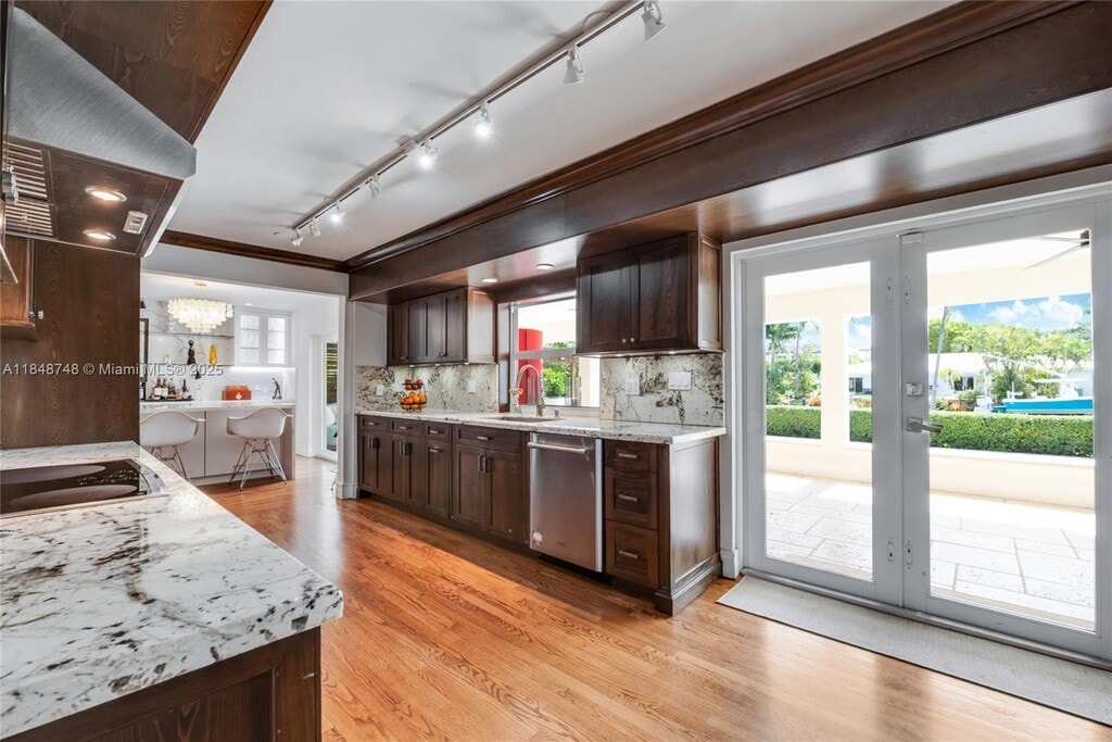 Pristine waterfront home for lease in the gated community of Gables by the Sea, offering 110' of water frontage with no bridges to the Biscayne Bay. This beautifully remodeled two-story residence features hardwood floors throughout, a stunning glass-enclosed, temperature-controlled wine cellar for 1,000+ bottles, a social bar-made for entertaining, and a spacious family room with fireplace that opens to expansive covered terrace. Enjoy outdoor living with a full summer kitchen, gas and wood BBQ, mini-fridge, ice maker, and a serene pool overlooking the canal. Upstairs includes the primary suite and two additional bedrooms; full cabana bath & en-suite guest room is on the 1st floor. Complete with boat davit, weather-station, circular brick driveway, & a whole-house generator. 2-car garage.