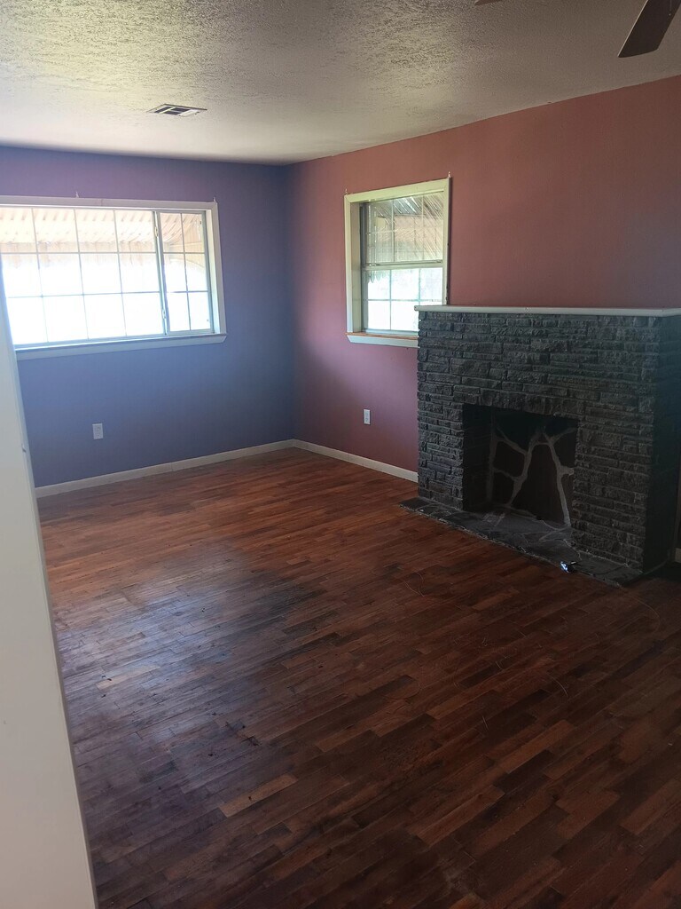 2 bed, 1 bath with extra room that could be used as a third bedroom! Enjoy a fireplace, large fenced in back yard, and natural wood floors throughout.