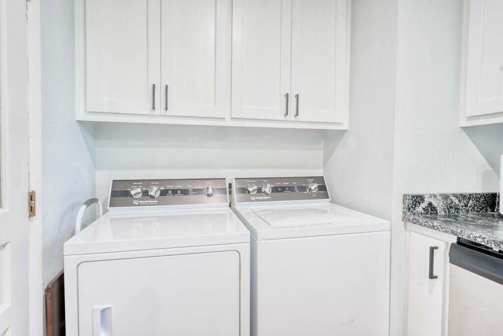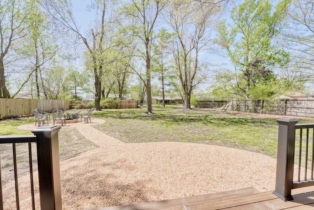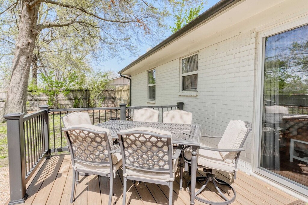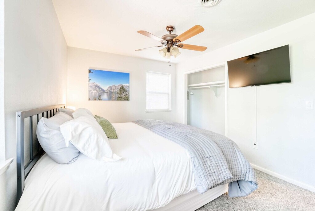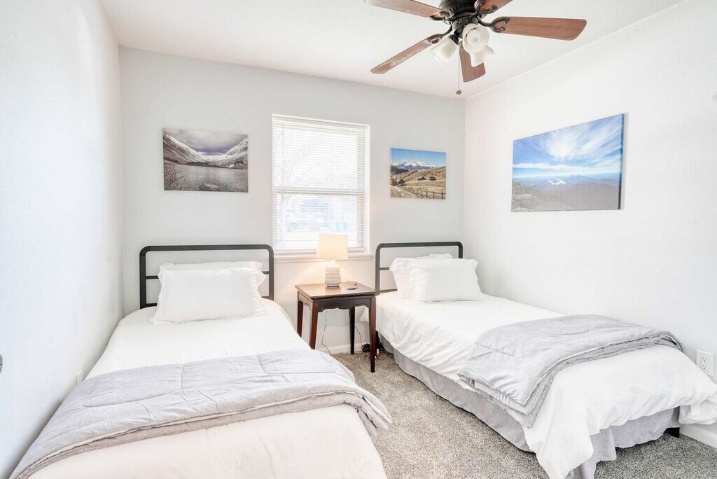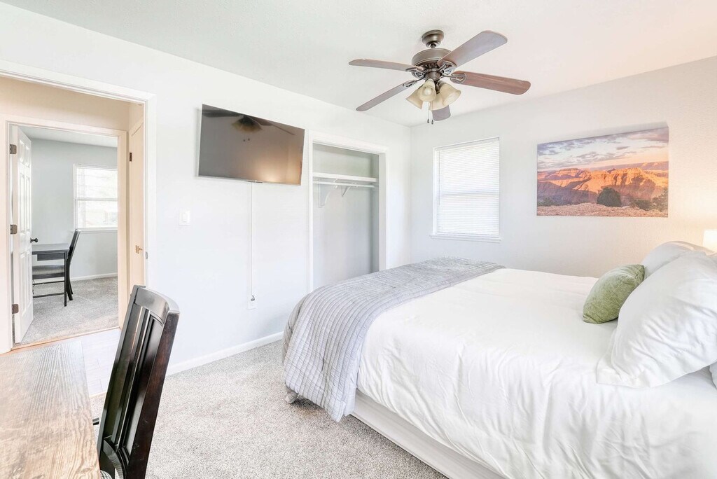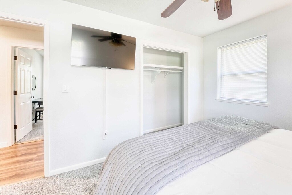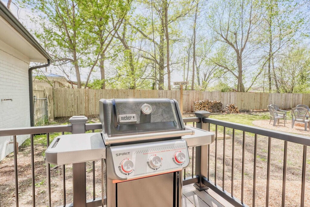 Welcome to your Bentonville base camp! Feel at home in this charming 3-bedroom residence designed for adventurers and families. Natural light fills the open living area, where a plush sectional and smart TV invite relaxation after a day of exploring. Located on E Street, the house is less than 1 mile from the downtown square, shops, art galleries, and restaurants. Drive or bike to Crystal Bridges, the Momentary, and Park Springs Trailhead in minutes. Quick access to I-49 makes day-trips to Fayetteville or Eureka Springs a breeze. An open layout makes gathering easy. The living room flows into a dining area and a fully equipped kitchen stocked with cookware, a coffee bar, seasonings, and a gas range. A breakfast bar is perfect for chatting with the chef. Restful bedrooms include a king bed with premium linens, blackout curtains, and a smart TV in the first bedroom, a queen bed and reading nook in the second, and twin bunk beds plus a pull-out trundle in the third, all equipped with USB chargers, fans, and luggage racks. The full bathroom offers a deep soaking tub/shower combo, fluffy towels, a hair dryer, and complimentary toiletries. Pet-friendly with a pet fee that may apply. Parking is available for up to three vehicles in the garage and driveway. Located in a quiet residential pocket off SE E Street, you'll feel like a local while being minutes from all the action. Walk or bike to Crystal Bridges Museum, Coler Mountain Bike Preserve, Park Springs Trailhead, and downtown Bentonville's lively square with restaurants, shops, and galleries. The neighborhood is safe, family-friendly, and filled with tree-lined streets. Expect an energetic vibe on weekends with trail traffic and events downtown. Quiet hours are from 9 PM to 8 AM, so please respect neighbors and noise ordinances. Enjoy the convenience of self-check-in with a secure keyless entry system. The home is professionally cleaned before every stay for comfort and safety. Long-term stays are welcome, and special monthly rates are available upon request. Includes high-speed Wi-Fi and a workspace. A laptop computer is not included. [SI]