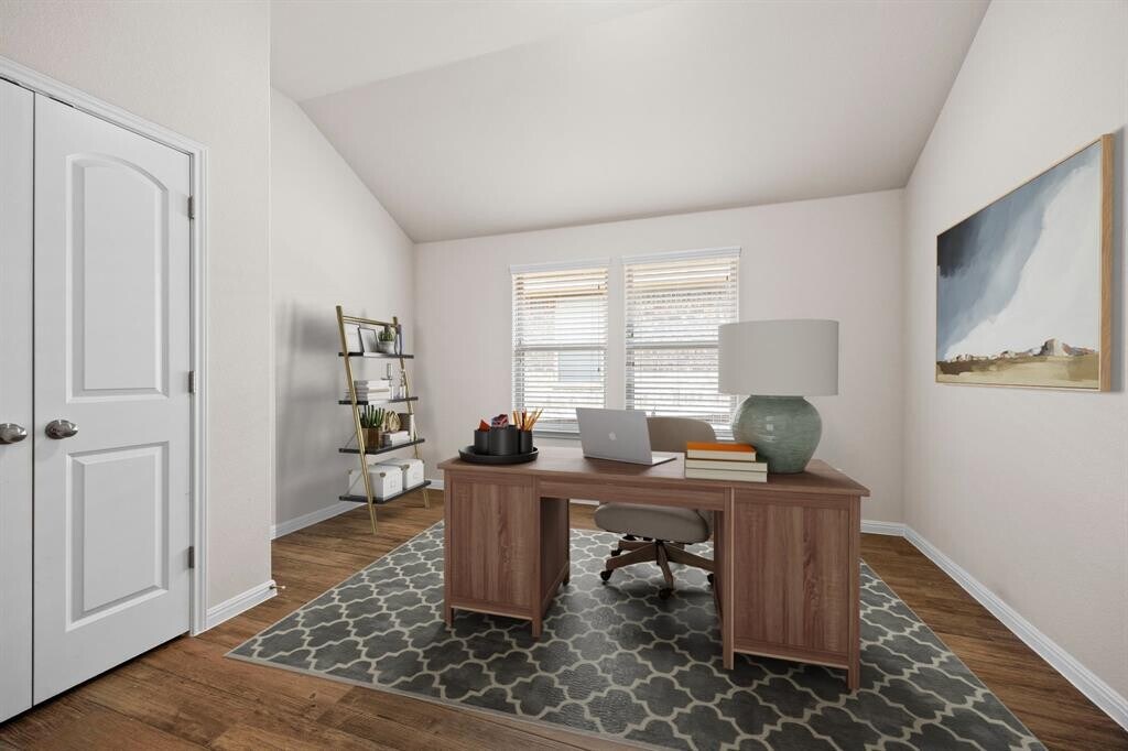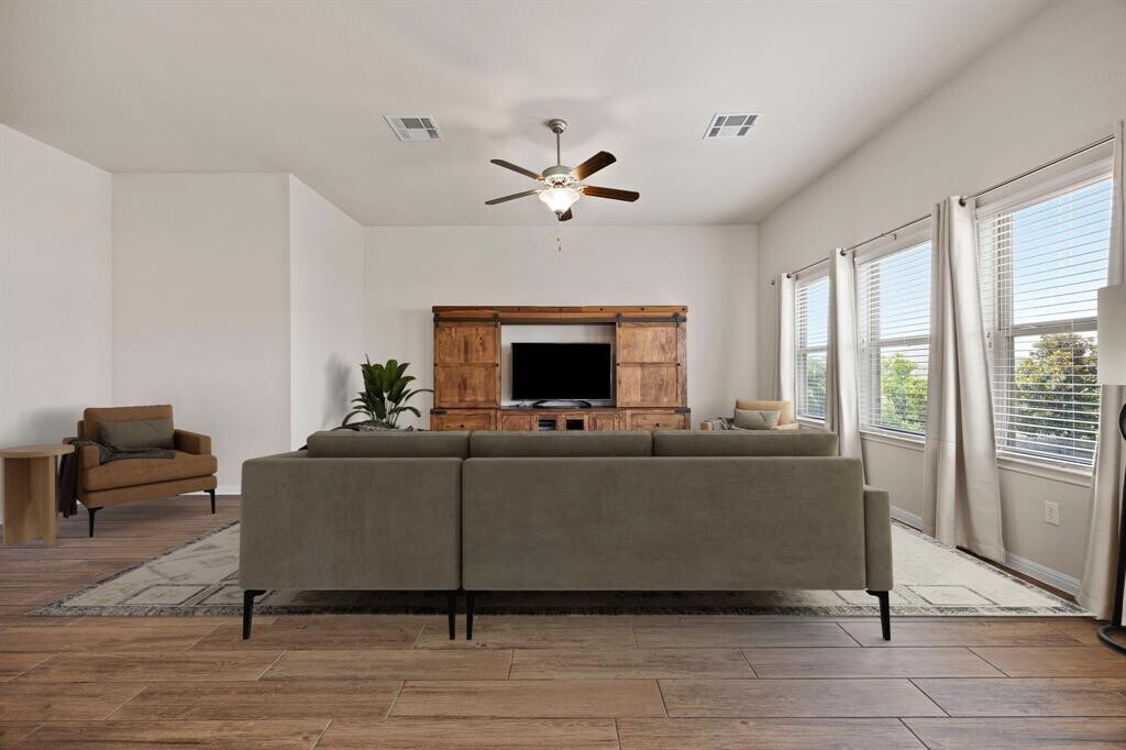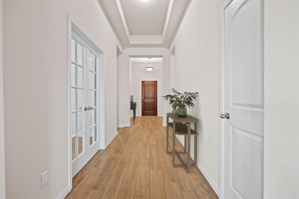 Welcome to this beautifully crafted single-story home in the highly sought-after Star Ranch community. Built in 2027, this 4-bedroom, 2-bathroom home offers 2,186 square feet of thoughtfully designed living space with style, comfort, and convenience in mind. Step inside to an open-concept layout that seamlessly connects the living, dining, and kitchen areas—perfect for entertaining or everyday living. The kitchen features a large island, granite countertops, stainless steel appliances, and 42-inch upper shaker cabinets, providing both function and elegance. The fourth bedroom, outfitted with French doors, is perfect as a home office or flexible living space. Throughout the main areas, you'll find beautiful wood-look tile flooring, with plush carpet in the bedrooms for added warmth. The spacious primary suite includes a luxurious en-suite bath with an oversized custom walk-in shower with dual shower heads, and a large walk-in closet. Step outside to a spacious backyard designed for relaxation and entertaining. Enjoy the shade of the covered patio and the extra space of an extended patio—ideal for grilling, gatherings, or quiet evenings under the stars. Located just 2 minutes from H-E-B and the 130 toll road, this home offers unbeatable access to downtown Austin, the airport, and major tech hubs. You're only 10 minutes from Stone Hill shopping center and just 15 minutes from the new Samsung plant in Taylor. With modern finishes, a flexible layout, and a backyard ready for outdoor living, this Star Ranch gem has it all. Come see it today!