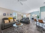 RENT BEFORE YOU BUY!!! This 2-bedroom, 2-bathroom Patio Villa in The Villages includes a 2-seat golf cart. The open floor plan features a dining area for six, a living room with dual loveseat recliners, a Smart TV, and a workspace. The kitchen includes a gas stove, counter space, and in-kitchen laundry behind bi-fold doors. The master bedroom has a king-size bed, Smart TV, and private bathroom with a walk-in shower. The guest bedroom has a queen bed and access to a bathroom with a tub/shower combo. Outdoor features include a screened lanai and birdcage patio with seating. Nearby amenities: Cason Hammock Adult Pool, Aviary Family Pool, Laurel Oaks Executive Course, and Southern Oaks Championship Golf Course. Evenings include live music and happy hour at The Market at Sawgrass Grove, the upcoming Eastport Town Square, and Brownwood Paddock Square. July-October $2250(monthly) plus taxes and fees-November-December $3480(monthly) plus taxes and fees. PLEASE CALL FOR PEAK SEASON(JAN-MAR) & WEEKLY RATES