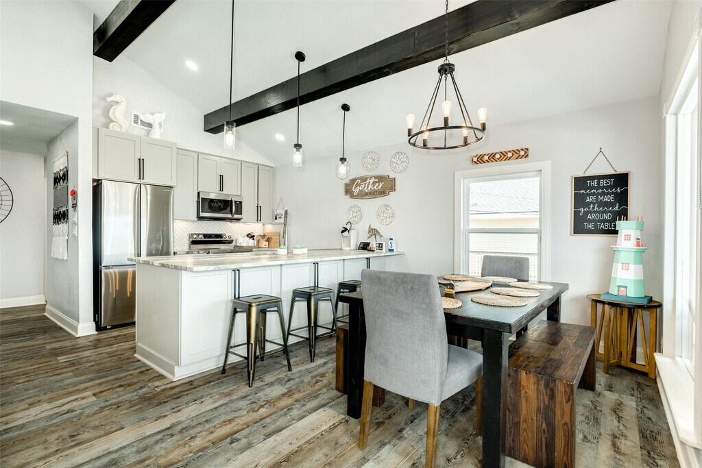 A must-see beach home with beautiful Gulf views!! This one has been fully remodeled. This 4 bedroom 3 bath home includes a newly completed lower level with a seating area,bunk room,and full bathroom that is not included in the listed square footage. Upstairs includes an open living and dining area with multiple large picture windows looking out to the Gulf. The new kitchen includes stainless steel appliances,granite countertops,and a kitchen eat-in bar. Upper-level large wrap-around deck with additional access from the primary bedroom. The lower level also includes a screened-in porch with Gulf views and an outdoor shower. Fully stocked kitchen included. New roof (2023) and tankless water heater(2022). Can be leased furnished or unfurnished. MLS# 18203722