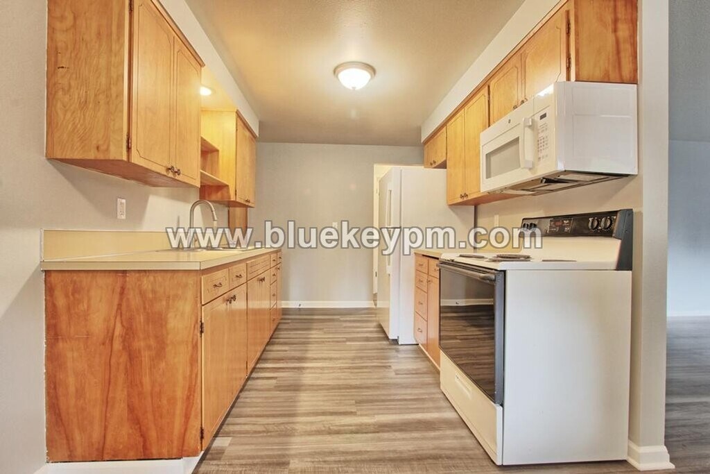 Newly remodeled 2 bedrooms and 1 bathroom duplex in Rose Village neighborhood at the corner of E 37th Street and N Street with new paint, luxury vinyl plank flooring, multiple new appliances and a new heat pump and water heater. Great location for easy commute on SR 500 or I-5. This home offers a fabulous yard with two separate fenced areas. It has a one car attached garage. The entrance of the home has a covered porch and sidewalk great for our rainy Pacific NW seasons. The living room is spacious with a picture window. The kitchen and dining room are very quaint with window viewing the front yard and plenty of cabinets and counter workspace. This home has an updated bathroom with a large vanity and tub/shower combo. The bedrooms are spacious and have new floors. Large master bedroom with dual closets! There is a fabulous linen closet in the hallway. Washer/dryer hookups are located in the garage for your use with your own machines. The home has a new heat pump for year round comfort. Pets are welcome to 35 lbs max weight. $800 additional refundable pet fee required per pet. Water/Sewer included in the rent. View our VIDEO tour on our website at Applications are online at our website Call Blue Key Property Management, Inc. at to schedule a showing Monday-Friday 9 am to 5:00 pm. $1795 Rent; $1795 Security deposit, $350 non refundable fee, $55 non refundable screening fee per adult age 18 and older. $800 additional refundable deposit per pet. Renter’s insurance required. For available homes, more information, rental criteria, video tours or online applications visit Blue Key Property Management, Inc. licensed in WA and OR. 1312 E 37th Street Vancouver, WA 98663