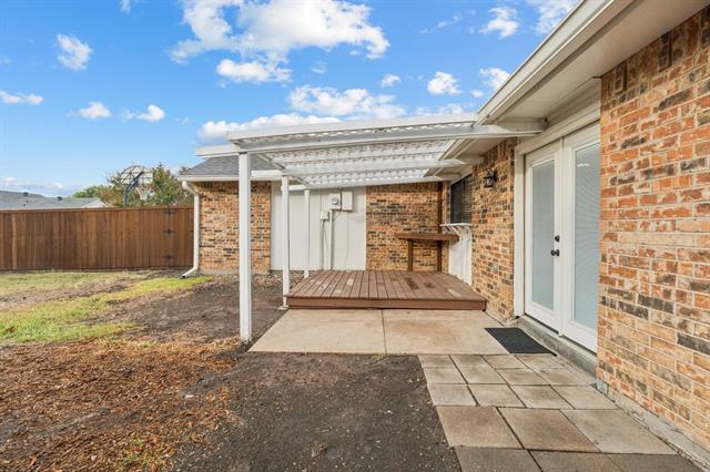 Delightful 1-Story in Allen — Move-In Ready! This charming home offers easy living with low-maintenance luxury vinyl and ceramic tile flooring throughout the main living, dining, walkways, and primary suite. Fresh interior paint and updated fixtures create a modern, inviting feel. The spacious living room centers around an impressive painted-brick fireplace with an extended hearth, while the dining area features French doors leading to a covered patio. The kitchen shines with stainless steel appliances, painted cabinetry with soft close hinges, granite countertops, and double windows that provide bar service to the pergola-covered deck — perfect for outdoor entertaining. The primary suite includes a private double-vanity dressing area and updated brushed-nickel lighting in the baths. Enjoy a covered deck and patio! Walk to top-rated schools and enjoy the convenience of nearby shopping, including H-E-B just around the corner!