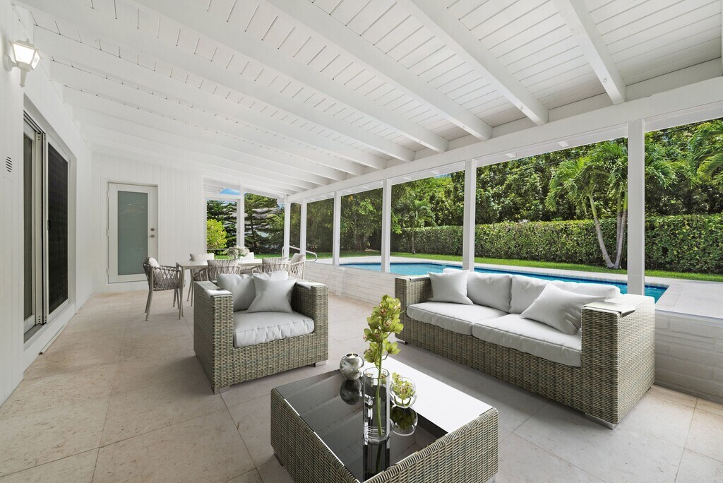 Nestled on a quiet street in Pinecrest, this beautifully updated three bedroom home with an additional efficiency ideal for a home office or in law suite offers comfort and privacy on a generous lot. Bright interiors feature vaulted ceilings, impact windows, white wood accents, and sleek terrazzo floors. The open kitchen includes white cabinetry, granite countertops, a subway tile backsplash, and an island perfect for entertaining. Enjoy a screened porch overlooking the pool, a peaceful fenced yard, three modern bathrooms, a two car carport, and included pool and yard maintenance. Move in ready and impeccably maintained.