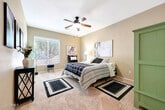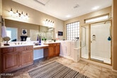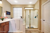 Gorgeous new Silestone countertops and a huge island make the kitchen a showstopper! Enter through the charming mission-style door into a beautifully oversized private courtyard at the front of the home,perfect for relaxing or entertaining. Inside,the foyer welcomes you with a lighted wall niche,leading into a spacious great room filled with natural light and accented by plantation shutters throughout. The open kitchen features newer stainless steel appliances and seamlessly connects to the living area,ideal for modern living. Brand-new carpet has just been installed in the bedrooms. The split floor plan offers privacy,with guest bedrooms separated from the generous primary suite. The primary bathroom includes a luxurious $8,900 walk-in tub,and the custom primary closet is outfitted with a professional organization system. Additional upgrades include an HVAC system and dual fuel gas stove,both replaced in 2018.