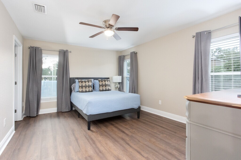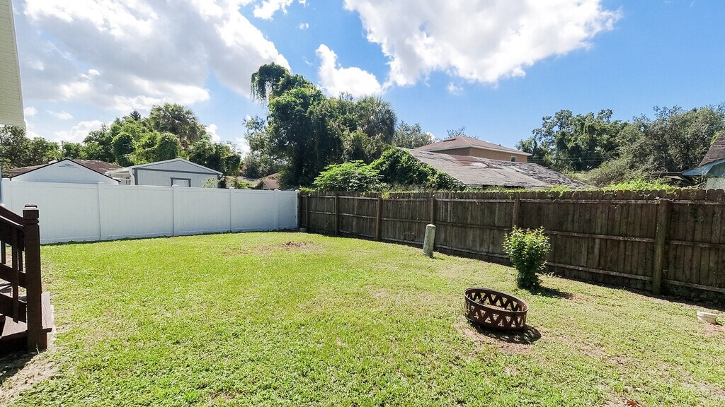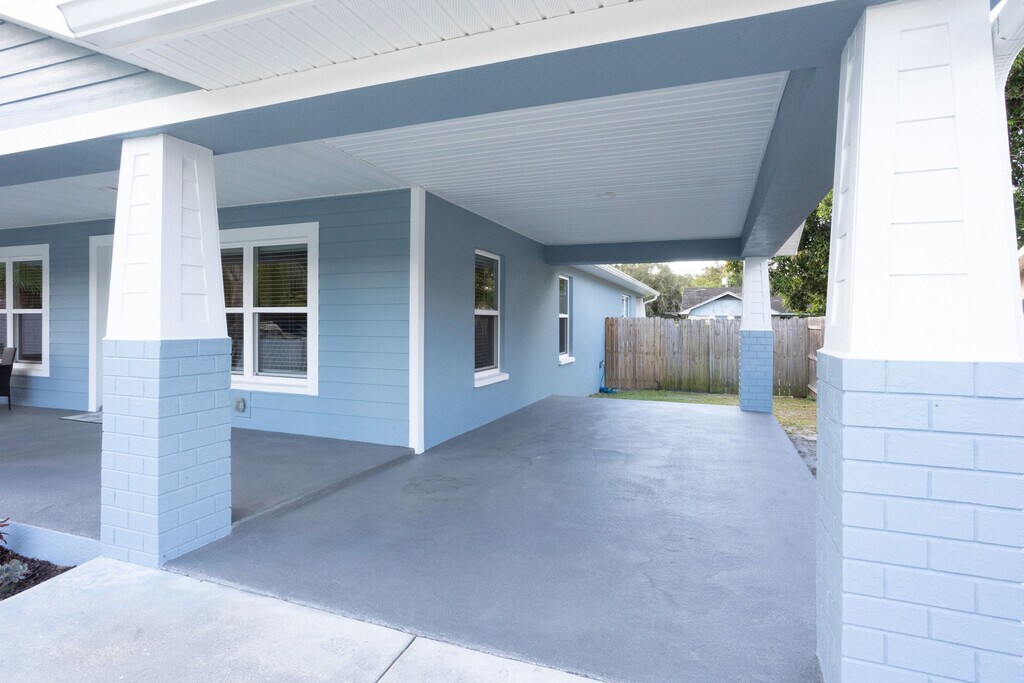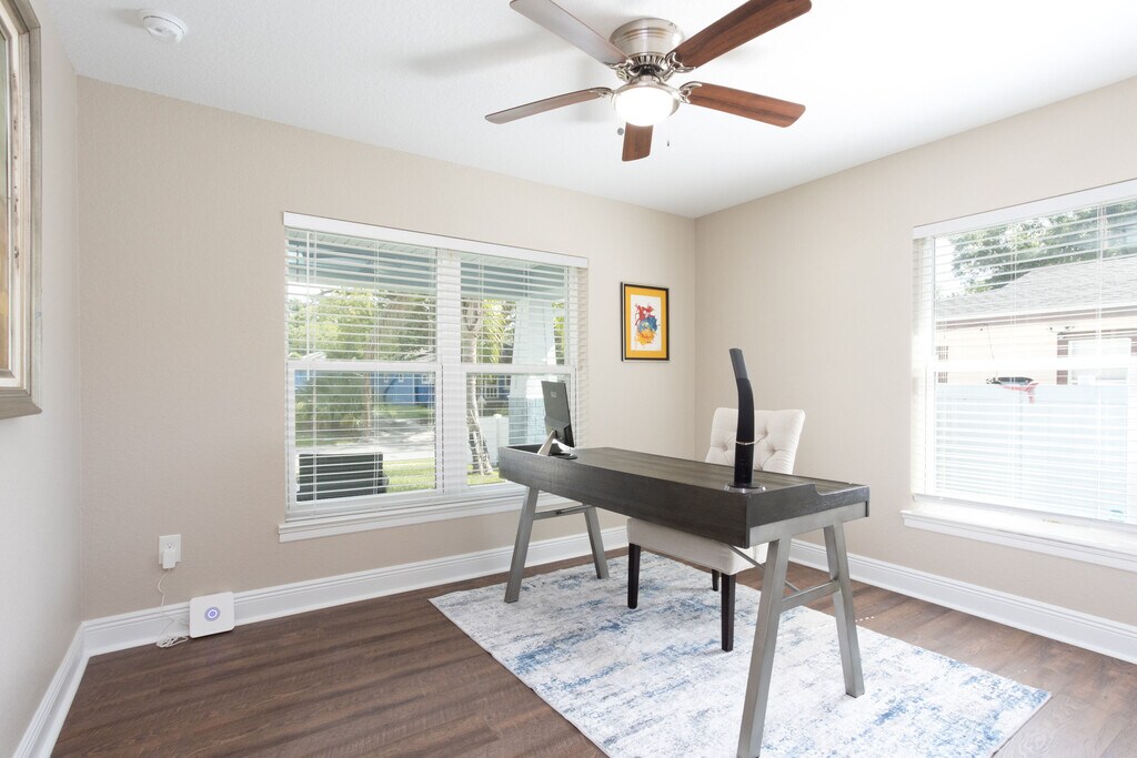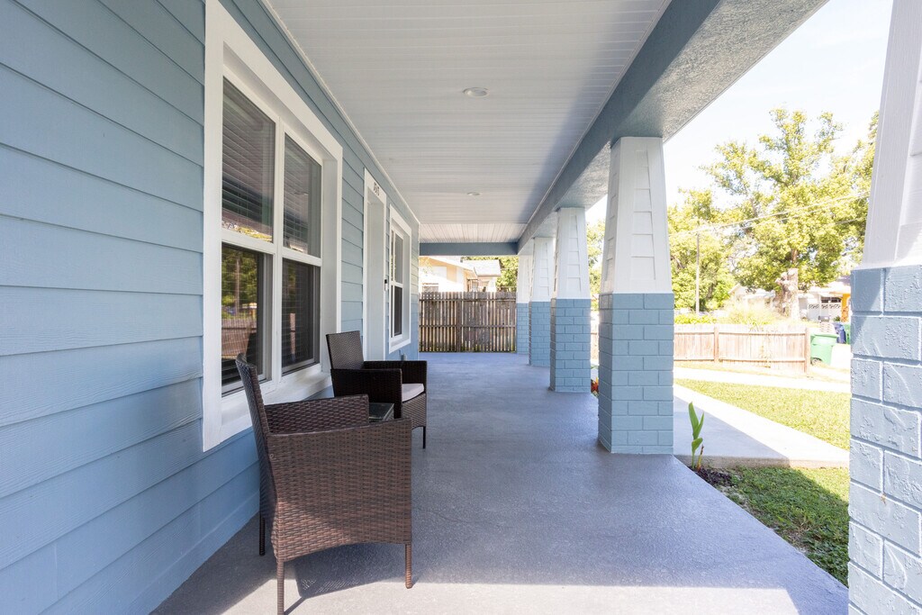 Located in the neighborhood of Seminole Heights, the area offers tranquility within central Tampa. This charming single-story house located in East Seminole Heights offers cozy and warm ambient peaceful living in the heart of Tampa! With over 1500 square feet, this bungalow has two bedrooms, two full bathrooms, and a dedicated office space. Perfect for traveling professionals, designed to offer the perfect balance of comfort and convenience in mind, in a stylish and stress-free living space. The primary bedroom suite has a queen bed, side table with power charge, full size dresser, Samsung Smart TV, ceiling light fans, black-out curtains, walk-in closet, and private bathroom/shower with a long vanity. The guest bedroom has a queen bed, full size dresser, closet, black-out curtains, and a ceiling light fan. There are two full size bathrooms with one located in the primary suite and other is a guest bathroom with tub/shower and single vanity. Linen closet in lighted hall with bed lines and towels. The living room offers ample space for entertainment and cozy relaxation with a 65 inch Samsung Smart TV, plush sofa-sleeper, accent chairs, side table with power charger, floor lamp, desk/table, and a modern remote-controlled ceiling fan. Kitchen and dining room is an open floor plan with plenty of cabinet space and a large pantry. The kitchen is fully equipped/stocked with full-size fridge, microwave, stove with oven, Cusinart toaster/air-fryer/coffee-maker, knives, blender, pots and pans, plates, glasses, etc. The kitchen also has a breakfast bar countertop with two stools and opens up to dining area with table and 4 chairs. Perfect for dining entertainment! The dedicated office space is equipped with a 6 feet modern desk, desk chair, surge protector, computer monitor, desk light, Frontier WiFi, ceiling light fan, small closet. Outside, the front porch has outdoor furniture seating, security camera, carport and driveway. The spacious backyard space is fenced in with palm trees and sitting area for those calm nights under the Tampa night sky. With a short 40-minute distance to beaches for some sunbathing and water-sports or kayaking in Wekiwa Springs or minutes from Hillsborough River, this home centers you in the heart of Tampa.
