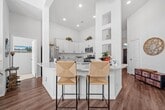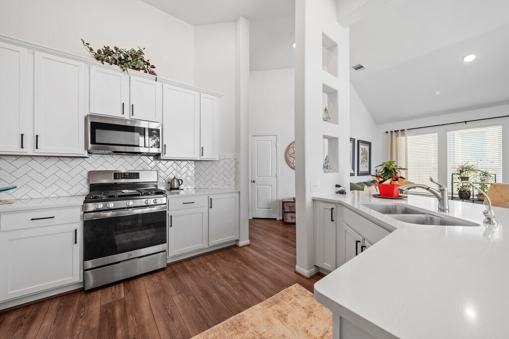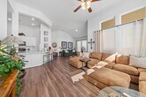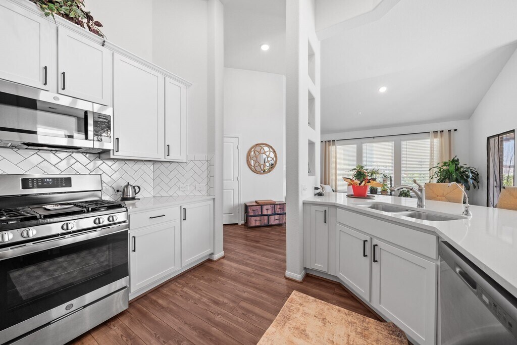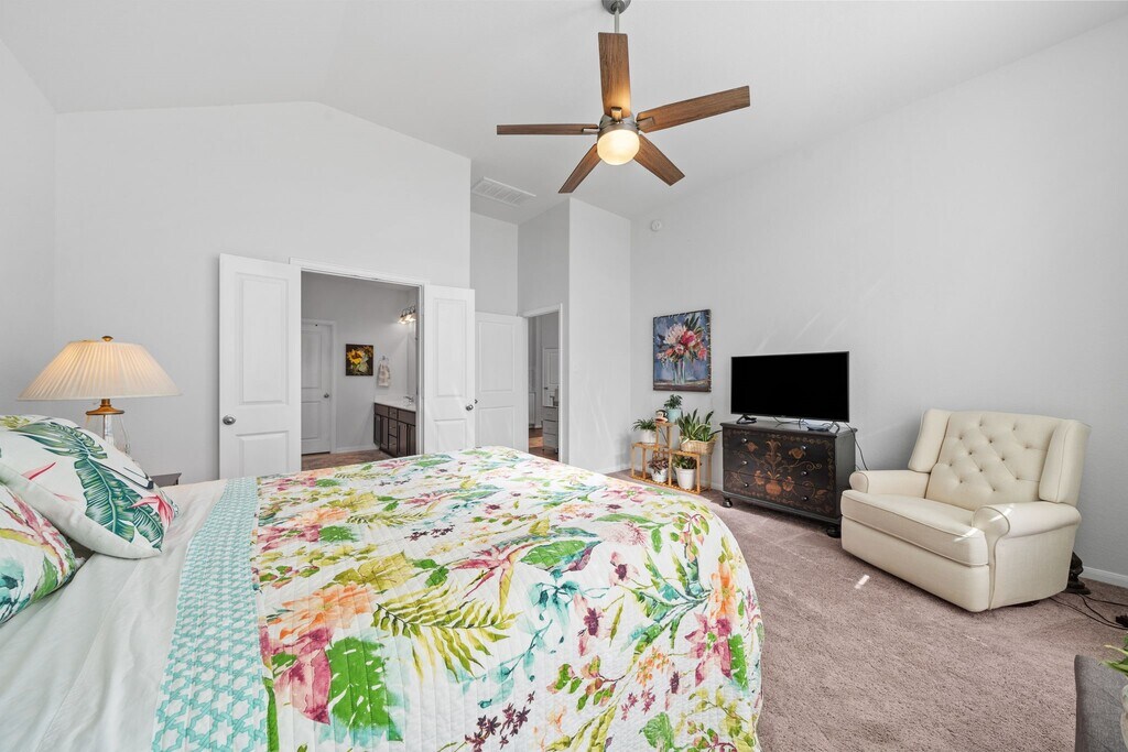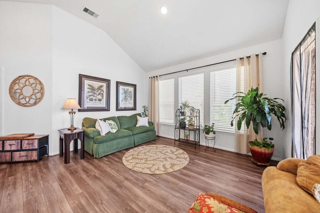 This single-story brick home offers a practical 3-bedroom,2-bathroom layout with a 2-car garage. All main areas with dark wood-look LVP flooring. Foyer leads into a living room with high vaulted ceilings and large windows. An open dining area sits between the kitchen and living room,providing easy movement and backyard access. The kitchen includes white cabinetry,herringbone tile backsplash,and a large island with a breakfast bar. The primary bedroom features vaulted ceilings,neutral carpeting,and large windows with backyard views. Its ensuite bathroom offers double sinks,a glass-enclosed walk-in shower,and a spacious walk-in closet. Two guest rooms share a full bathroom with a shower-tub combo,with one room easily serving as a home office. The backyard includes a small covered patio and no rear neighbors. Located near FM 2854 and TX-105 in Montgomery,the home provides quick access to Lake Conroe. MLS# 10825799