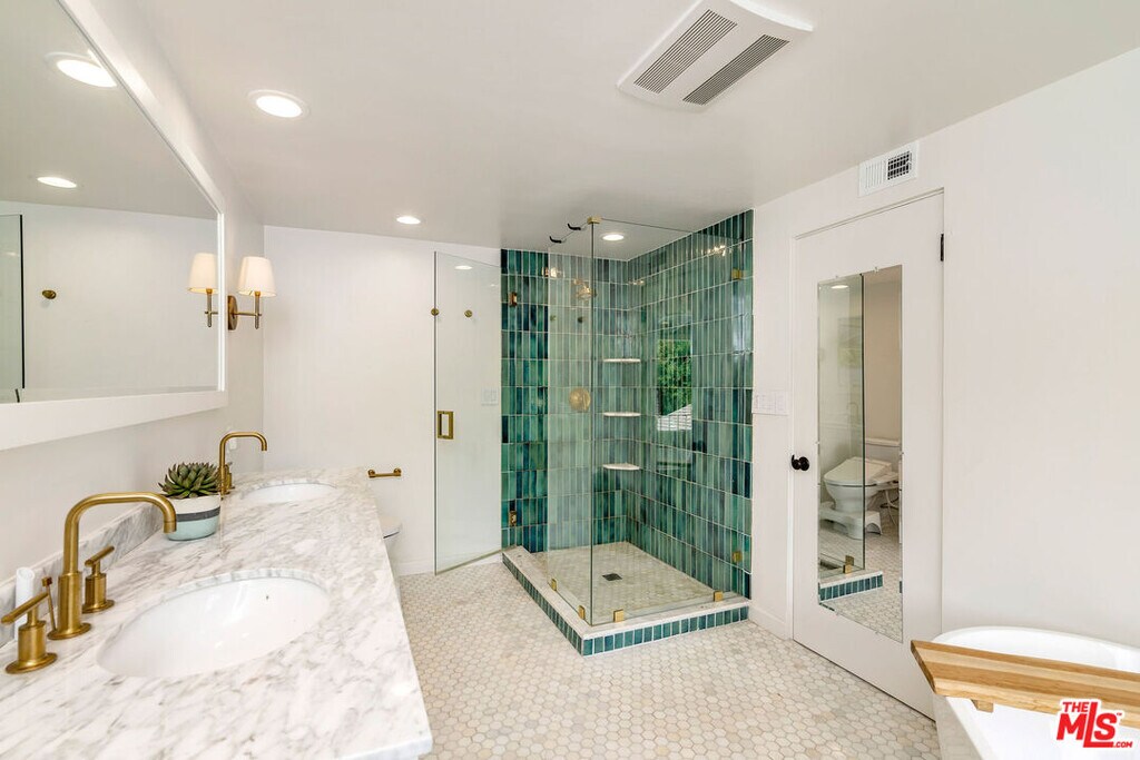 Prime Sherman Oaks 4 bedroom, 4 bathroom traditional home recently redone with a modern farmhouse style. This light and bright home is equipped with skylights, a formal living room, separate dining room off the Chef's kitchen with additional breakfast nook/pantry. The over-sized family room with vaulted ceilings boasts a separate wet bar perfect for entertaining or for family gatherings with sliders opening up to the grassy yard and sparkling pool. The downstairs en suite bedroom is perfect for guests and no detail was spared in the build out of closests. The over-sized master has 2 large walk in closests and a private balcony overlooking the pool. The other two bedrooms feature a shared jack and jill bathroom with marble shower and abundant closet space. This perfect bright traditional family home is now available in a coveted, quiet area of Sherman Oaks MLS# 25619883