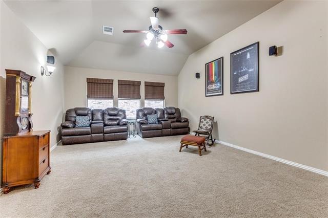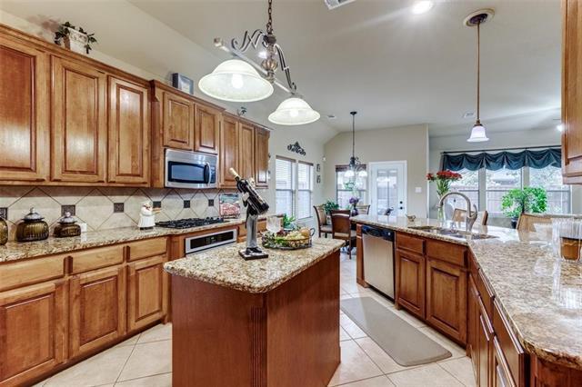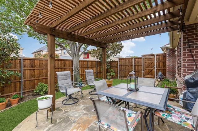 Beautifully maintained, north-facing 1.5-story home built in 2007 by its original owner, located in the desirable Villages at Willow Bay and zoned to Frisco ISD. The main floor features 3 bedrooms, 2 baths, and a dedicated study, while the upper level offers a large game or media room with a full bath. The entry opens to a study with double doors, perfect for a home office. Enjoy formal living with 2021 engineered wood flooring and a formal dining room enhanced by crown molding and graceful arches ideal for entertaining. The inviting family room includes a corner gas log fireplace with a stylish mantel and flows seamlessly into the gourmet kitchen and sunny breakfast area, with a wall of windows overlooking an extended flagstone patio with pergola. The kitchen boasts granite countertops, 42-inch maple cabinetry with fluted detailing, stainless steel appliances, a vented gas cooktop, breakfast bar, recessed lighting, and an island with pendant lighting. The private, oversized split primary suite features a sitting area, 2021 engineered wood floors, and a spa-like bathroom with dual vanities, a separate shower, and a jetted tub. BRAND NEW REFRIDGERATOR, WASHER AND DRYER.