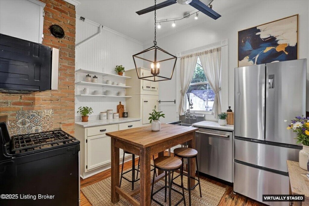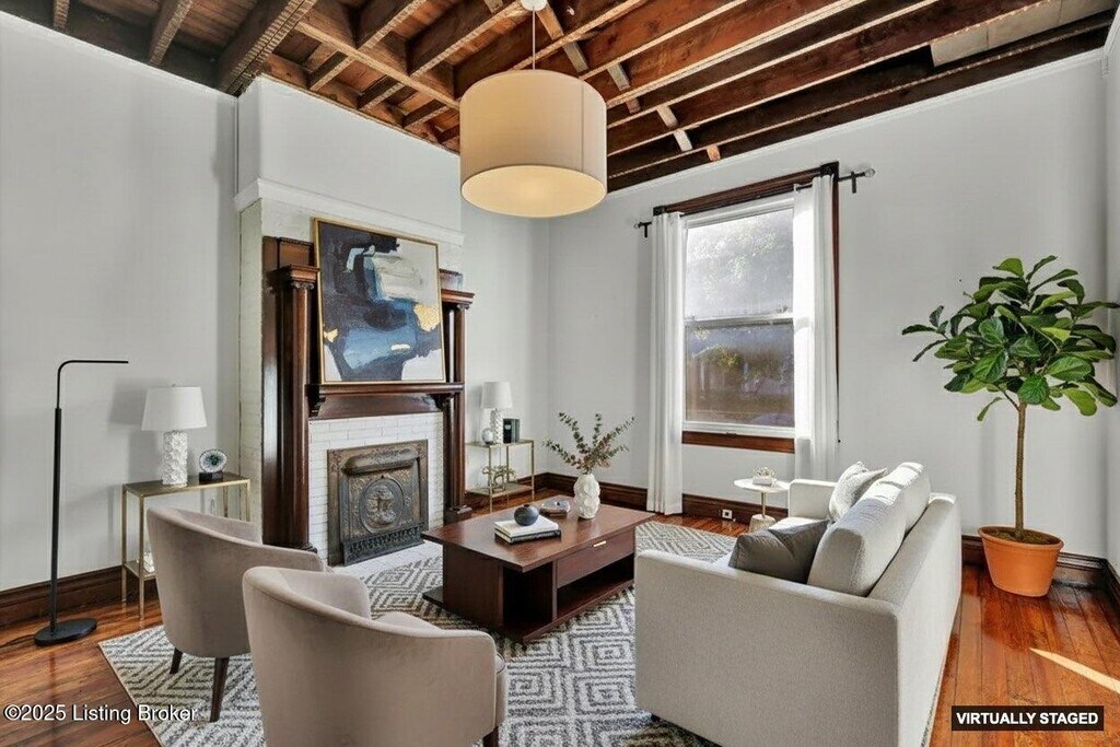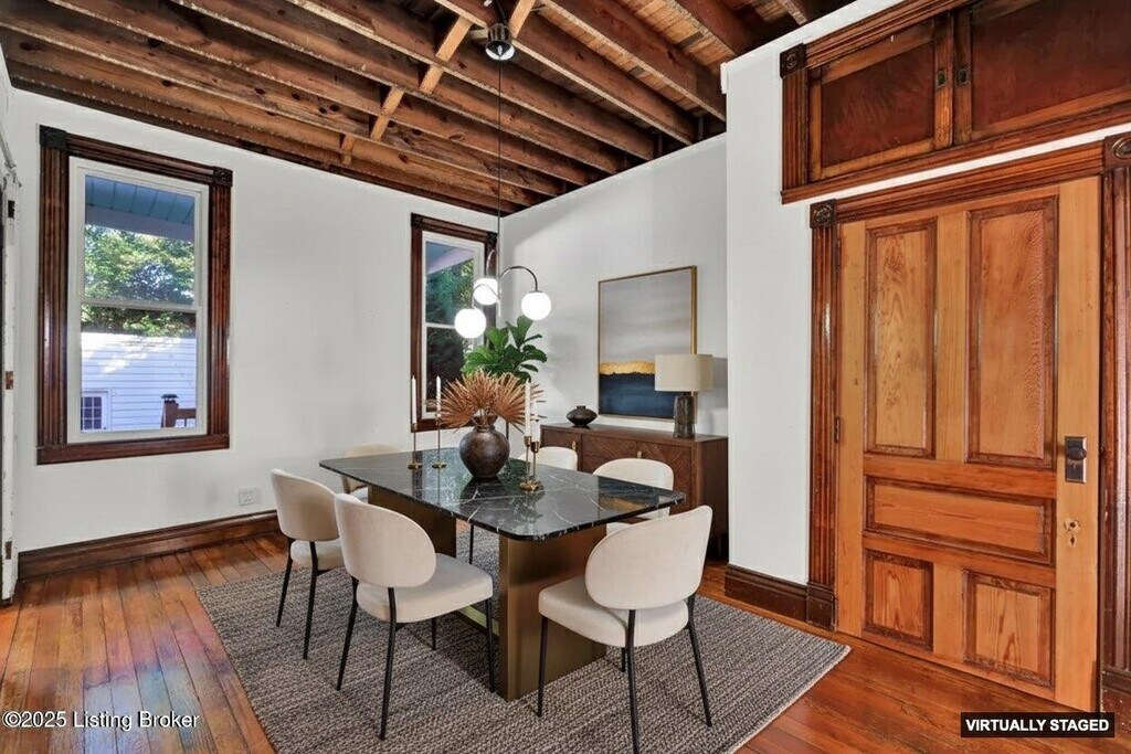 This traditional style home in the Original Highlands is a stunning four bedroom,2 full bath home that boasts three levels of living space,featuring high ceilings,hardwood floors,architecturally rich doors,moldings and woodwork. The spacious and inviting living room and attached formal dining room spotlight dramatic,exposed-rafter ceilings and bright windows providing abundant natural light. The industrial-style kitchen is equipped with a unique utility sink,custom cabinetry.
