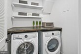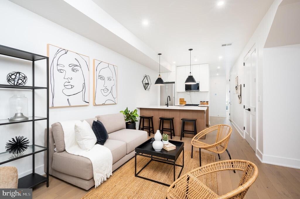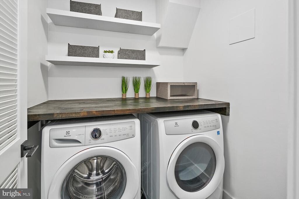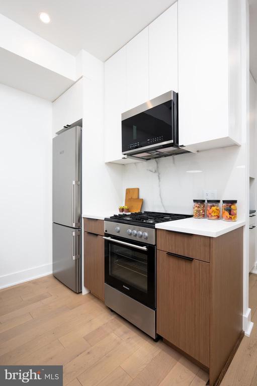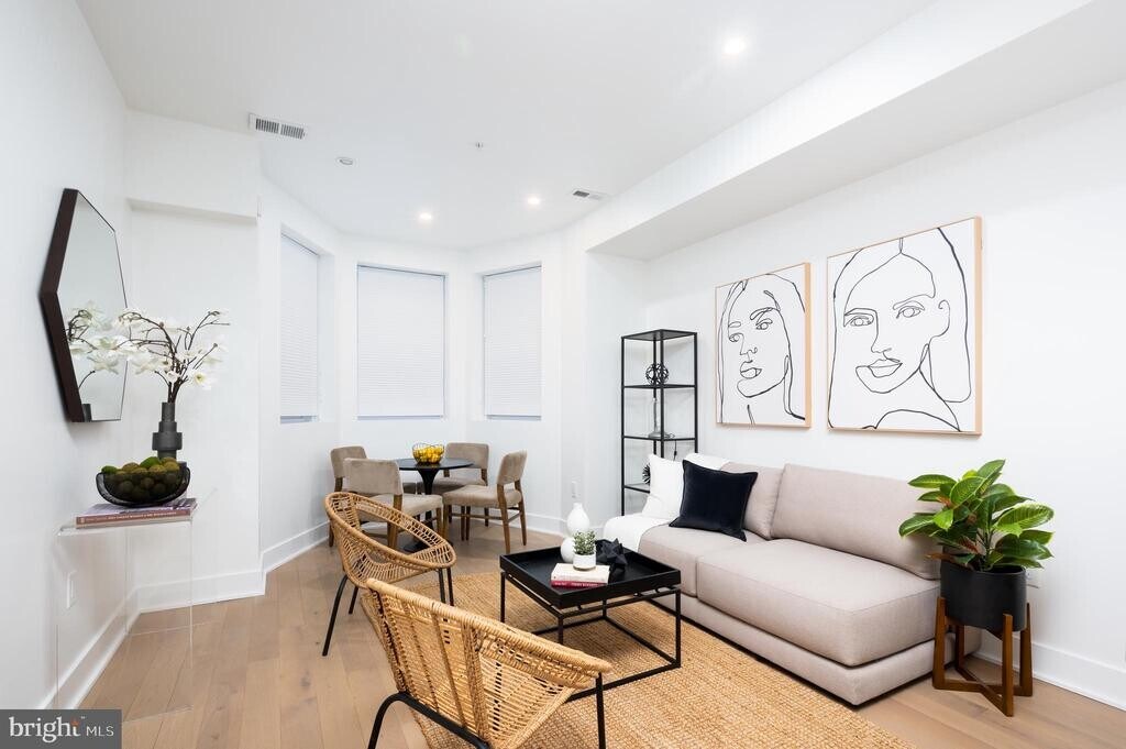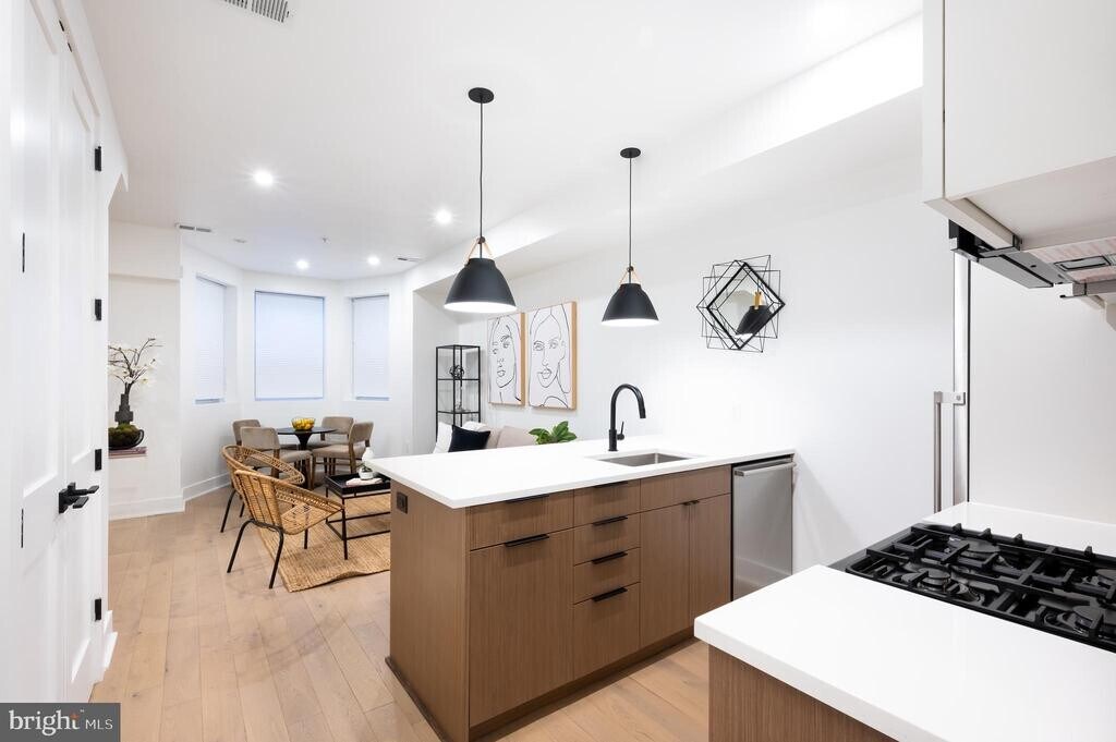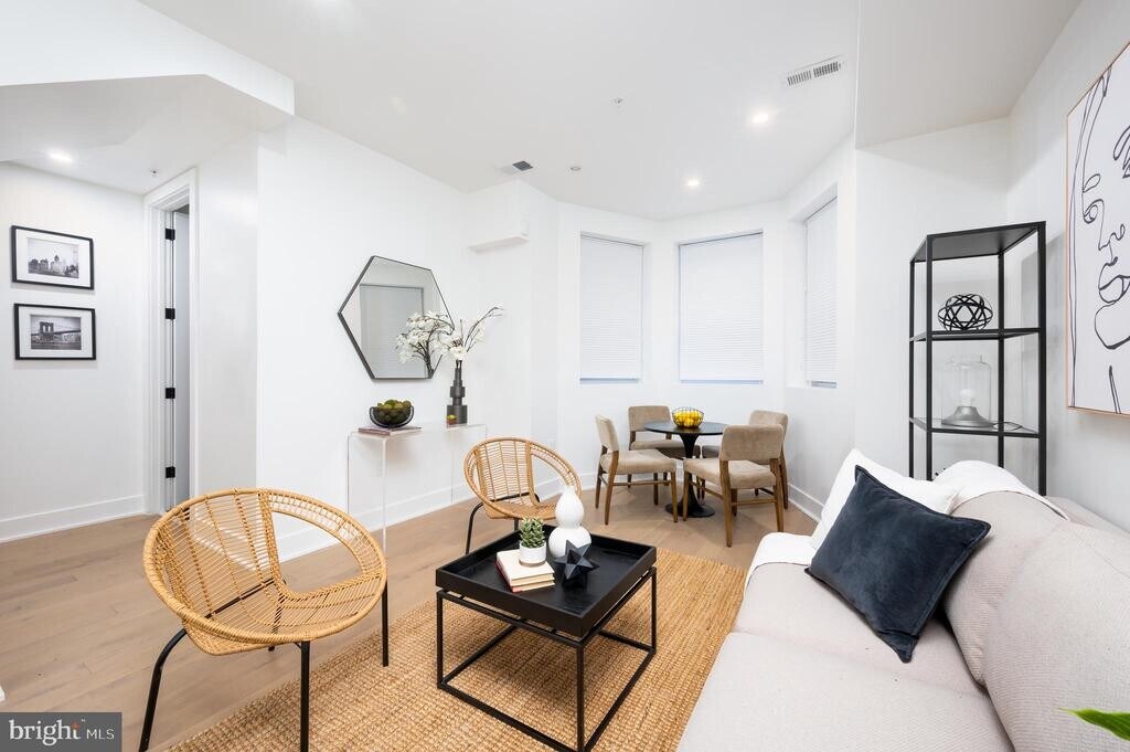 Fully renovated home features modern finishes in an open floor plan. White oak floors, 10’ ceilings, designer lighting and plumbing throughout. The gourmet kitchen with gas cooking and a seated island opens to a large living area with a bay window. The designer powder room boasts marble floors and a wall mounted faucet. Down the hall is a full bath with a large soaking tub and two bedrooms with ample closet space. Additional features include a dedicated laundry room, abundant built-in storage and outdoor space. Ideally located just blocks to the Green and Yellow Metro lines, Whole Foods, Giant, restaurants and more.