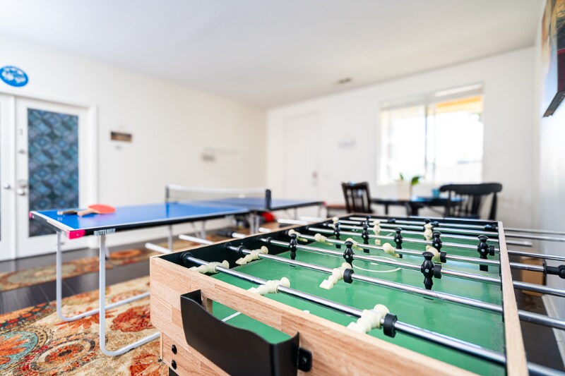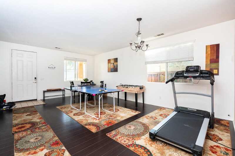 Property Id: 2205253 Relax in this spacious ground-floor King bedroom with desk and Roku TV and your own dedicated private bathroom that is a few paces outside the room. We are an Airbnb and there are a few other rooms in the home that may host guests or be rented out. We don't have many guest/bookings and we prefer peace and quiet. The home is cleaned on a daily basis and professionally deep-cleaned regularly. The host and a shy resident cat reside in the home in their own private suite. The cat does not roam around the home. The house is in a quiet neighborhood on a cul de sac. Our next door neighbor has large dogs that bark if you're in the backyard. The living room has a large sectional couch in front of a TV & electric fireplace. The front of the home is a large game room. The backyard has outdoor furniture & the "high desert" air - pure of pollutions and toxins. You also have access to the home's open kitchen and dining area and upstairs laundry facilities. See on Airbnb: