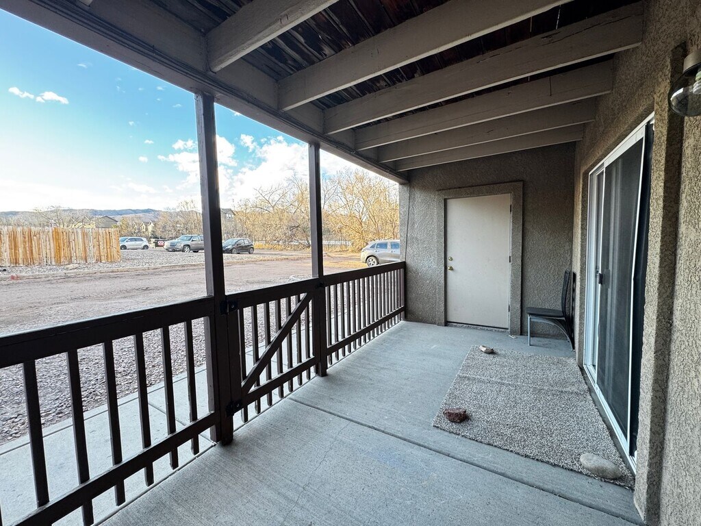 As you step into this charming unit, you're welcomed by a spacious living room featuring a cozy wood-burning fireplace, perfect for those chilly winter nights. The room flows into the kitchen that has a built in breakfast bar perfect for quick easy meals. Down the hall, you’ll find two generously sized bedrooms with ample closet space, along with a full bathroom. Off the living room you have a sliding glass door that leads to a private, covered concrete patio, ideal for relaxing or enjoying the outdoors. A gate from the patio provides convenient access to the parking lot. It is in a great central location, close to I-25 with easy access to the entire city. Additionally, the well-maintained community laundry area with coin-operated machines is just outside your door, simplifying laundry day. This spacious yet cozy 2-bedroom, 1-bathroom unit is ready for you to make it your home. Cross Streets- Garden of the Gods Rd & Centennial Blvd A/C- No R, R/O, Dw, Ds Community Coin Operated Laundry Water and Trash Included *Special requirements: No pets allowed Trash W/Tote Water