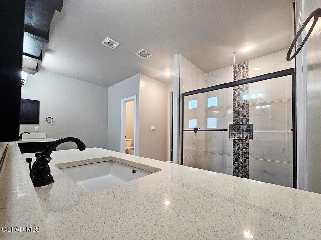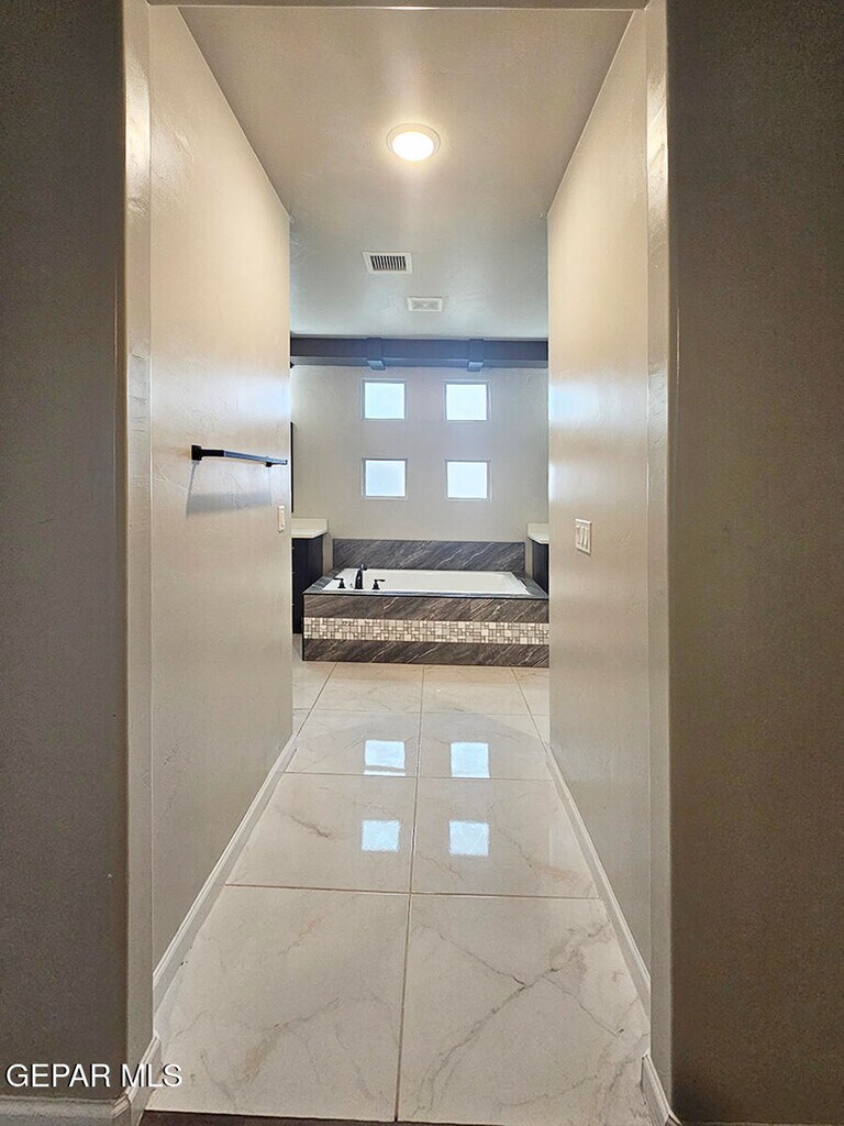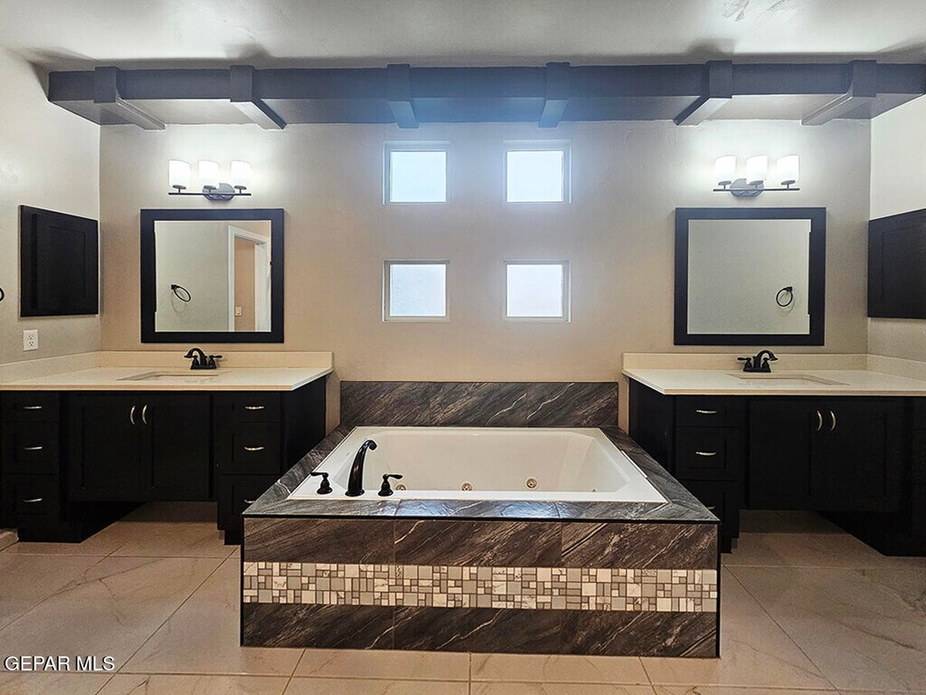 Step into this custom design Spanish style villa where luxury,comfort and tranquility are just a few of its features. This 4 bedroom 3 bath home was designed with families in mind. The 25 foot ceilings make it a one of a kind open layout design,perfect for entertaining guests while serving the best dishes made from the gourmet kitchen. The ample size rooms can fit easily a queen bed without feeling cramped. The primary room and master bathroom will make you feel like right at home with its high end finishes. It's all around flooring make it easy to clean so you don't have to worry about allergens or dust. Some other features are the tankless water heater,double refrigeration units,all around security cameras,shutters through out,front landscape and backyard artificial turf,huge storage in the backyard,located in Cul-De-Sac with no traffic,and many other features. Short distance to Ft Bliss,shopping centers and schools. Schedule your viewing today!