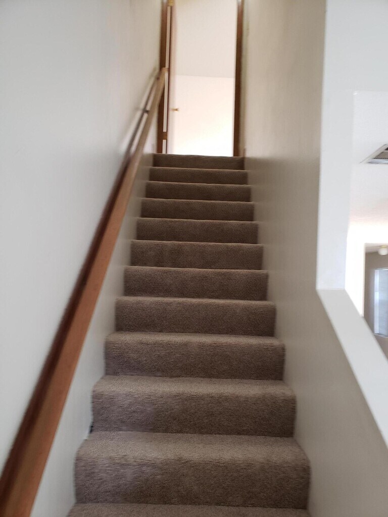 Great floor plan. Living room, dining area, kitchen, full bath and bedroom downstairs with large walk in closet. Master bedroom suit upstairs. ceramic tile and new carpet flooring. Two walk in closets up stairs.