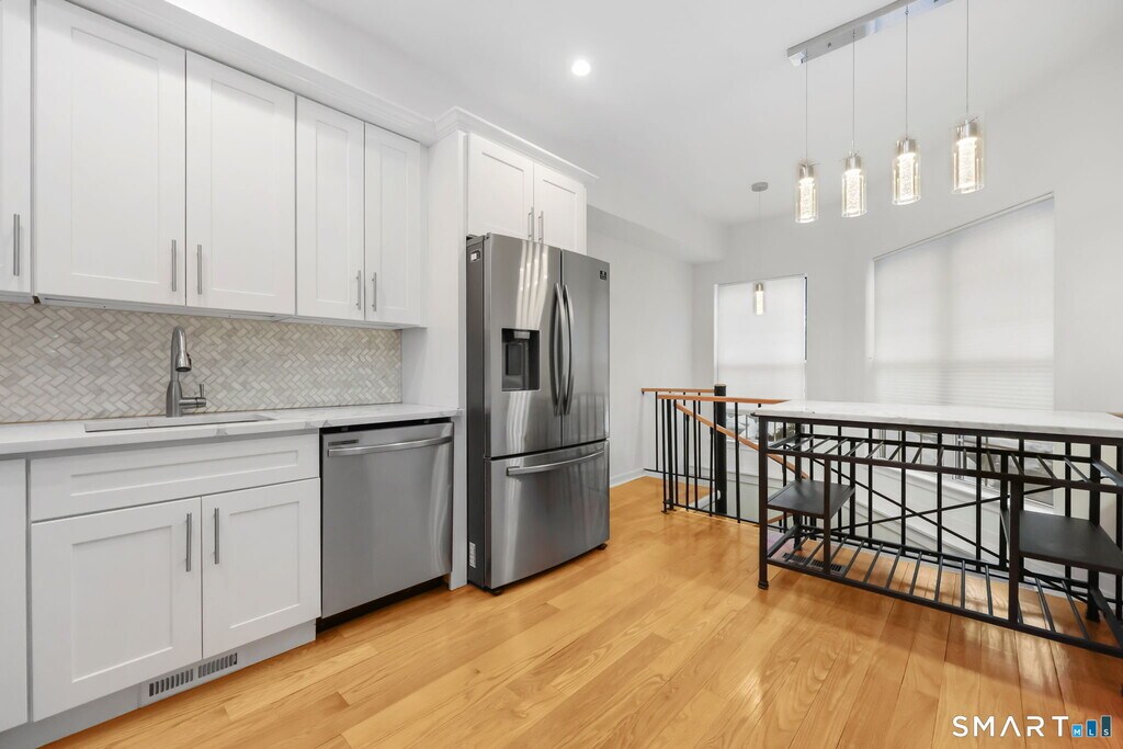 Call for Availability - Move right in and enjoy this bright, welcoming four-level home offering two bedrooms and two and a half baths. Sunlight fills each level, highlighting gleaming wood floors, beautifully updated bathrooms, and an eat-in kitchen with stainless steel appliances that's ready for everyday living and easy entertaining. The living room feels both inviting and refined, centered around the wood-burning fireplace with a sleek gray marble hearth. Upstairs, the primary suite is a peaceful retreat with a soaring cathedral ceiling and a marble bath featuring a double vanity and a spacious walk-in shower. Spacious 2nd bedroom, full marble bath, and stacked W/D complete the 2nd floor. The third-floor loft is filled with natural light and offers flexible space ideal for a home office, den, or exercise area. On the lower level, you'll find space perfect for a mudroom, recreation area, or workspace, along with direct access to a generous two-car garage. Set within the desirable Gazebo complex, this turnkey home offers easy access to downtown Stamford, Stamford Hospital Tully Health Center, the Ferguson library, popular dining, and convenient shopping. With the Glenbrook Metro-North station under a mile away and Stamford Station less than two miles away, this home delivers comfort, convenience, and an easy, low-maintenance lifestyle. Available for rent or to own, you don't want to miss the chance to make 132 Hope Street, C, your home. MLS# 24152518