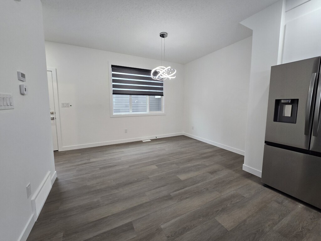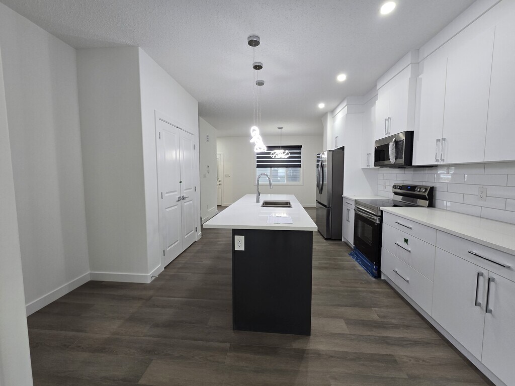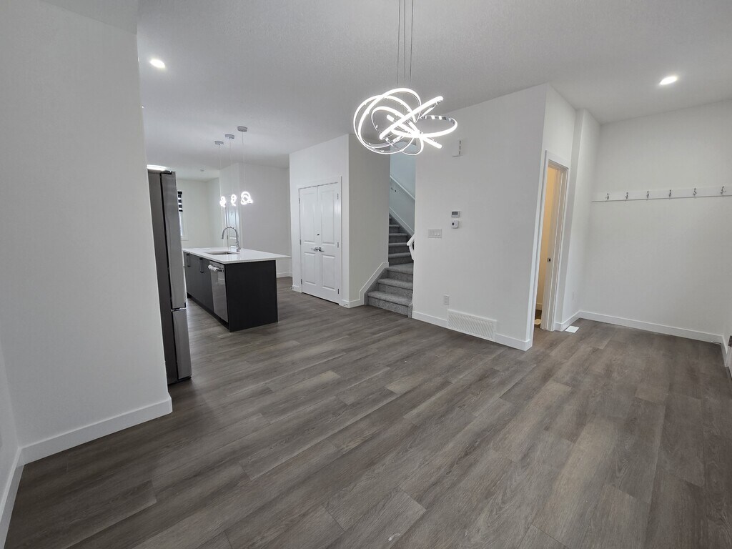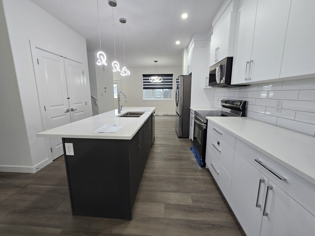 BRAND NEW 3 BED · 2.5 BATH – MOVE IN JAN 1 Address: 129 Mitchell Bend, Leduc Rent: $2100 + $400 Fixed utilities - high-speed WiFi included! Garage: Double car garage included Pets: Negotiable Smoking: Not allowed HOME FEATURES Brand-new construction — never lived in Spacious open-concept main floor with luxury vinyl plank flooring Large living room with big windows and zebra blinds Modern upgraded light fixtures throughout High-end kitchen with quartz countertops and full-height cabinetry Stainless steel appliances (French-door fridge, stove, microwave, dishwasher) Large kitchen island with double sink and premium chrome faucet Walk-in pantry with built-in shelving Dining area with designer chandelier and backyard access Main floor half bathroom with modern finishes 3 spacious bedrooms with large windows and closets Primary bedroom with full walk-in closet 2 full bathrooms with quartz counters and tiled tub/shower Upper-floor laundry with Samsung washer & dryer Wide hallway with bright, clean layout Plush carpet on upper level All utilities + WiFi included Ideal for families or working professionals LOCATION BENEFITS Quiet new community in Leduc Close to schools, parks, and playgrounds Minutes from grocery stores, restaurants, and shopping Quick access to Highway 2 10 minutes to Edmonton International Airport Message now to book a viewing — this beautiful home won't last!