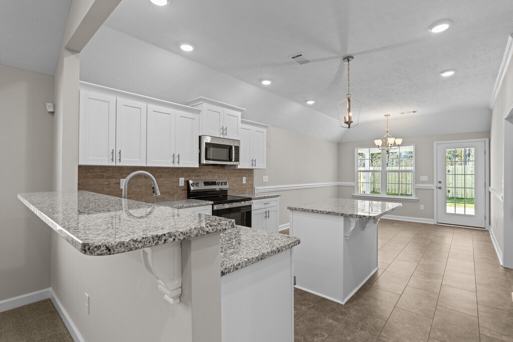 Available for late February occupancy! Brand new ranch home in Haynes Station! Covered entrance. Foyer leads to living room with vaulted ceiling, ceiling fan and flex room with french door entry - can be used for office/study, playroom, etc. Open, eat-in kitchen with granite countertops, breakfast bar and kitchen island, stained cabinets, pantry and stainless-steel appliances. Dining area off kitchen with rear door to covered patio and backyard. Power pantry with extra water line hookup! Split bedroom plan. Master Bath with trey ceiling, ceiling fan. En suite master bath with double sink vanity, tub/shower combo, two linen closets and entrance to very large walk-in closet. Bedroom #2 and Bedroom #3 have large closets and additional full bathroom in hallway with tub/shower combo. Laundry room with cupboard storage space. Mudroom area off two-car garage. Security system for tenant activation. Privacy fenced yard and covered patio. Community pool access included.