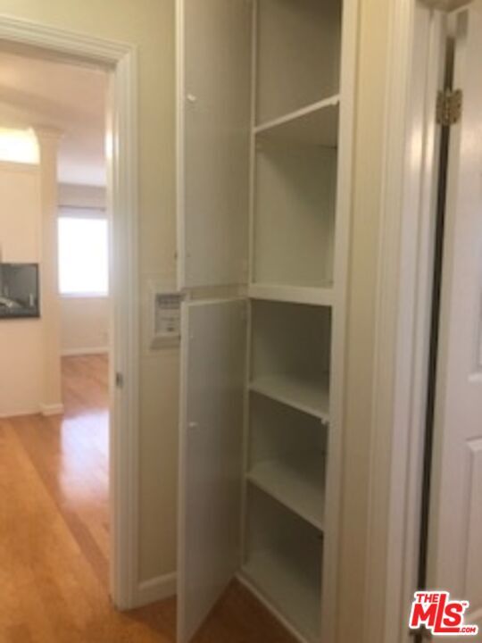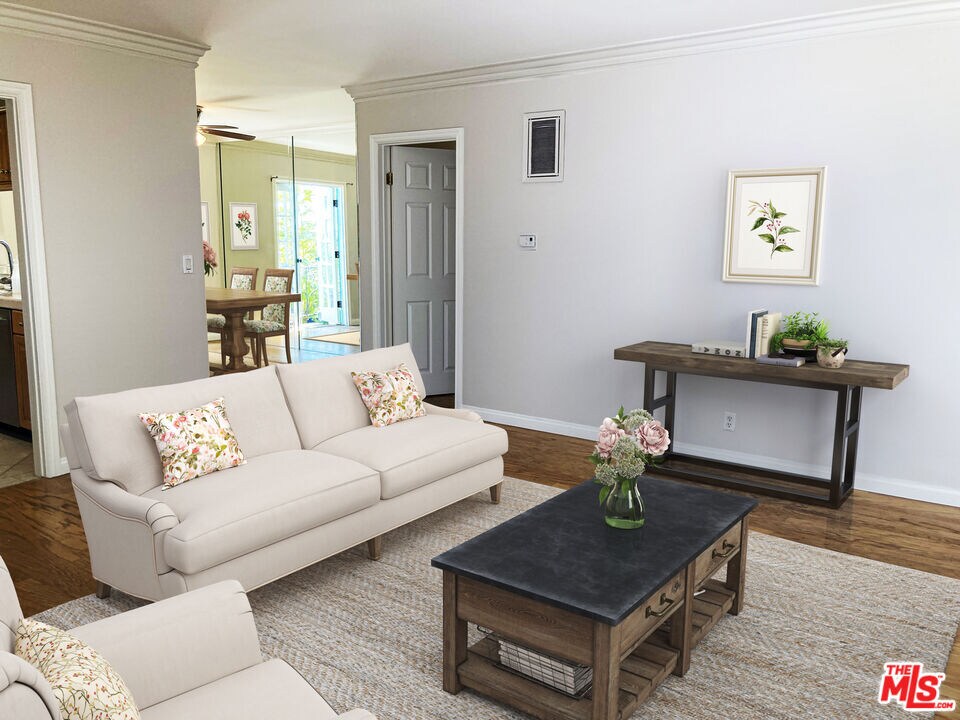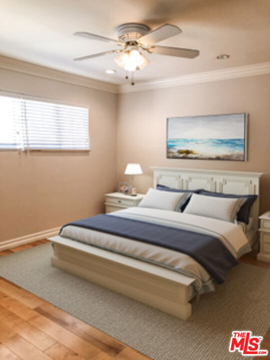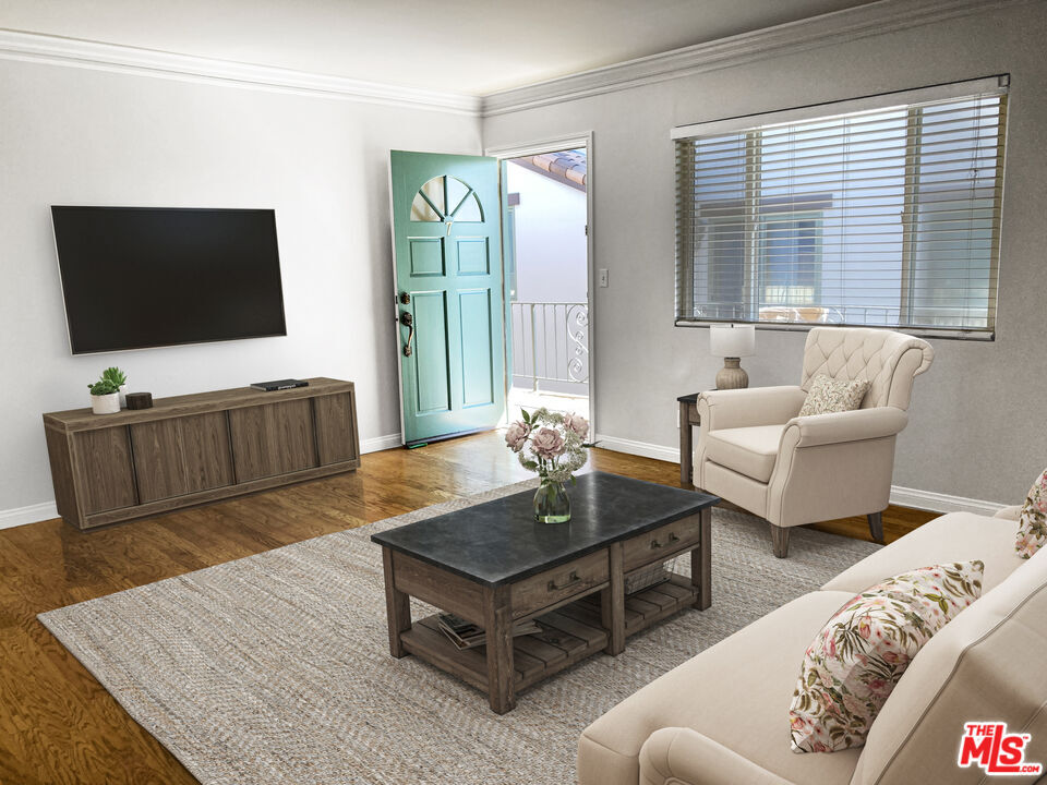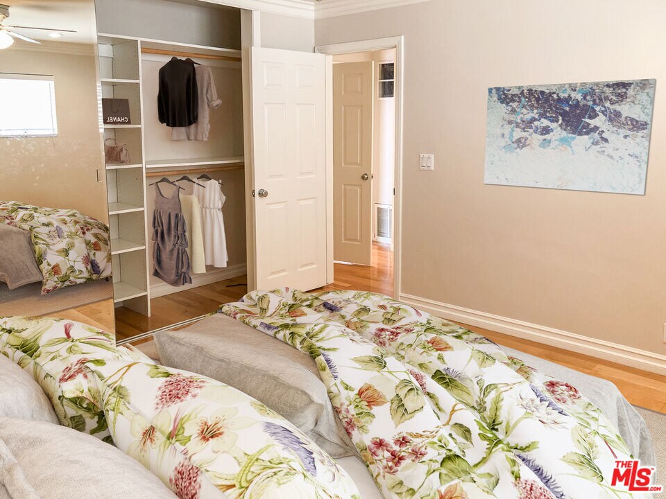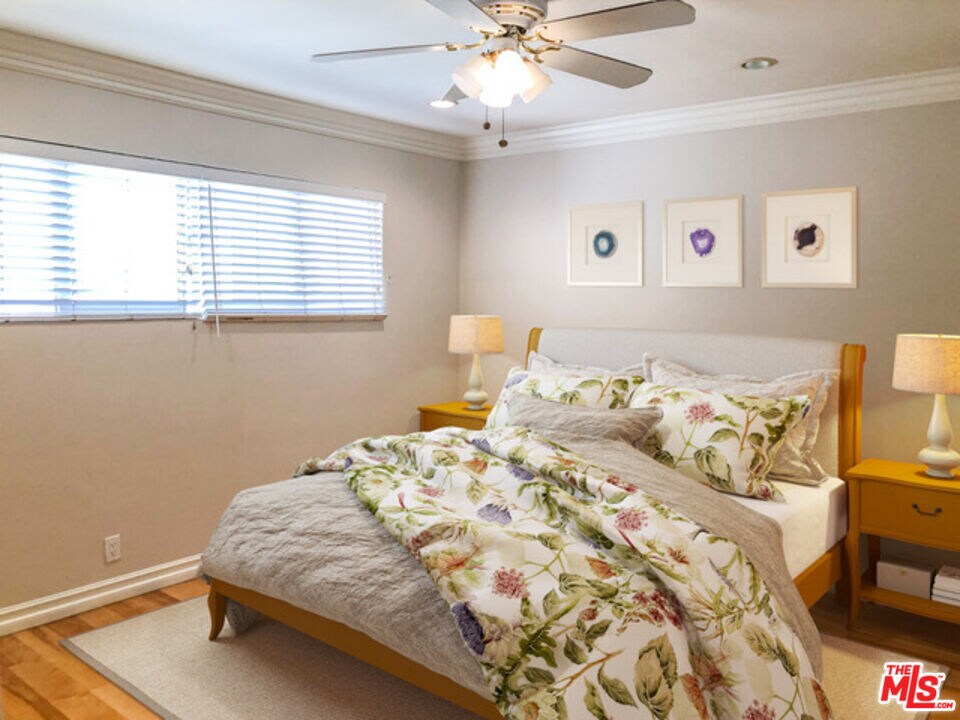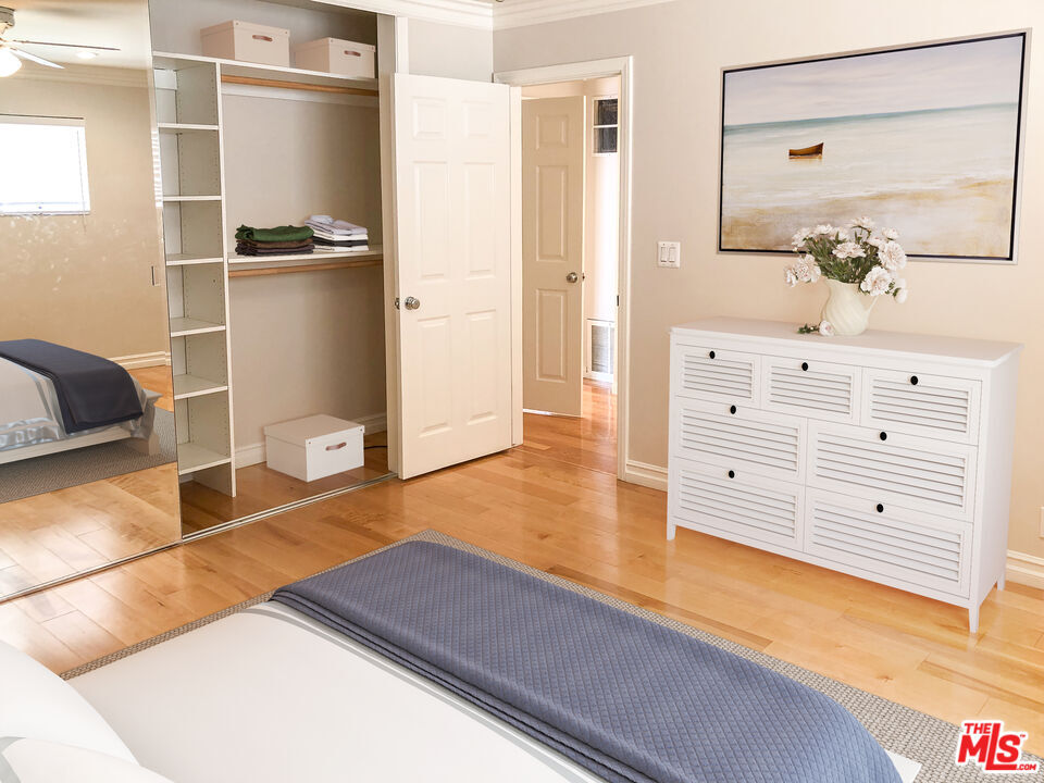 Fabulous Private front unit with lots of windows for light, spacious living & dining room. Galley kitchen With granite countertops & stainless steel appliances. Master bedroom with ensuite walk-in shower & wall to wall custom closet. Large second bedroom with wall to wall custom closet. Ceiling fans, hallway separates bedrooms with floor to ceiling linen cabinet & beautiful hardwood floors throughout. Only one common wall. One car parking. Quite boutique building. Close to grocery store, shopping, coffee houses, restaurants, metro, 3rd Street Promenade, Pacific Ocean, and Palisades Park . Butterfly Intercom System - Secured Entrance. Virtually Staged. Must see! MLS# 26665511