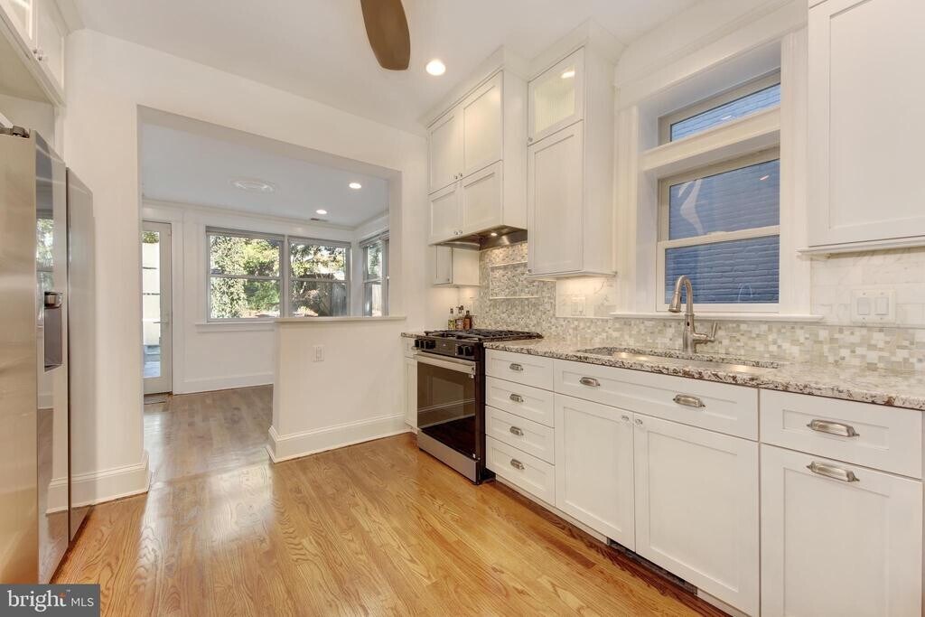 Lovely, updated row house in Columbia Heights. A charming front porch with ample space to sit, enjoy and even entertain. This home is welcoming with generous room sizes, high ceilings, original architectural details and gleaming wood floors. Kitchen has been renovated and sparkles. Charming extra room with garden access - ideal as a breakfast room, small den or home office. The upper level has three bedrooms plus a light-filled sun room and two full AND renovated bathrooms. Some additonal storage available in attic. Garden is private and large enough to enjoy with friends or family. One car, off street parking or use the Petworth Metro, only .4 miles away. Enjoy the best of all that Columbia Heights has to offer while striking the perfect balance between convenience and tranquility. Low energy costs, thanks to solar panels. House is available immediately, two-year lease minimum.