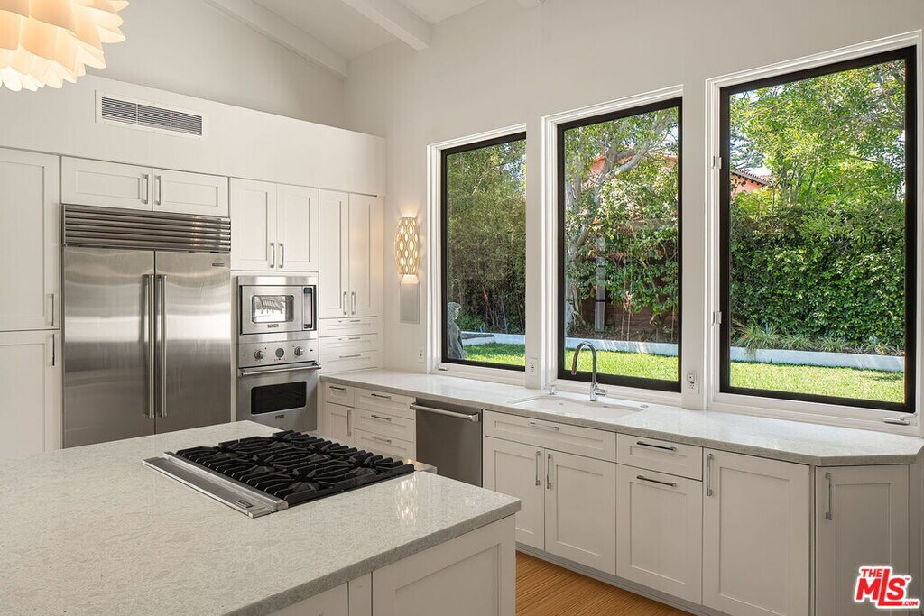 Perched in one of Westwood's most coveted enclaves Comstock Hills, this stunning contemporary residence at 1323 Club View Drive offers sweeping panoramic views over the Los Angeles Country Club, glittering city lights, and majestic mountains beyond. Spanning 4,839 square feet, this impeccably designed 6-bedroom, 7-bathroom home welcomes you with warm wood floors and expansive, light-filled living spaces framed by oversized windows that capture serene garden greenery. A gracious foyer flows into a sophisticated living room anchored by a travertine fireplace, leading seamlessly to a formal dining room and a fully renovated gourmet kitchen beneath soaring vaulted ceilings. Designed for both entertaining and everyday living, the kitchen features a large seated island, premium Viking and Sub-Zero appliances, and direct access to outdoor patios. The main level also features a state-of-the-art home theater with 7-speaker surround sound, a guest suite, and access to a versatile lower-level den. Upstairs is an exceptional primary retreat complete with a spa-inspired bathroom featuring a steam shower, soaking tub, and a private sitting area with an oversized picture window showcasing breathtaking views. A loft-style office with built-ins and an upstairs laundry area add convenience and functionality. The private backyard is a true oasis, enveloped by mature hedging and lush landscaping with a natural lawn. Multiple outdoor entertaining areas include a flagstone patio with a fire pit and automatic shades, a tranquil water feature, and an alfresco dining space with built-in banquette seating. Ideally located just moments from Beverly Hills, Westwood Village, premier shopping and dining, and within the highly sought-after Fairburn Avenue Elementary School bounds, this remarkable residence delivers lifestyle and location in one of Los Angeles' most prestigious neighborhoods. MLS ID 26727573