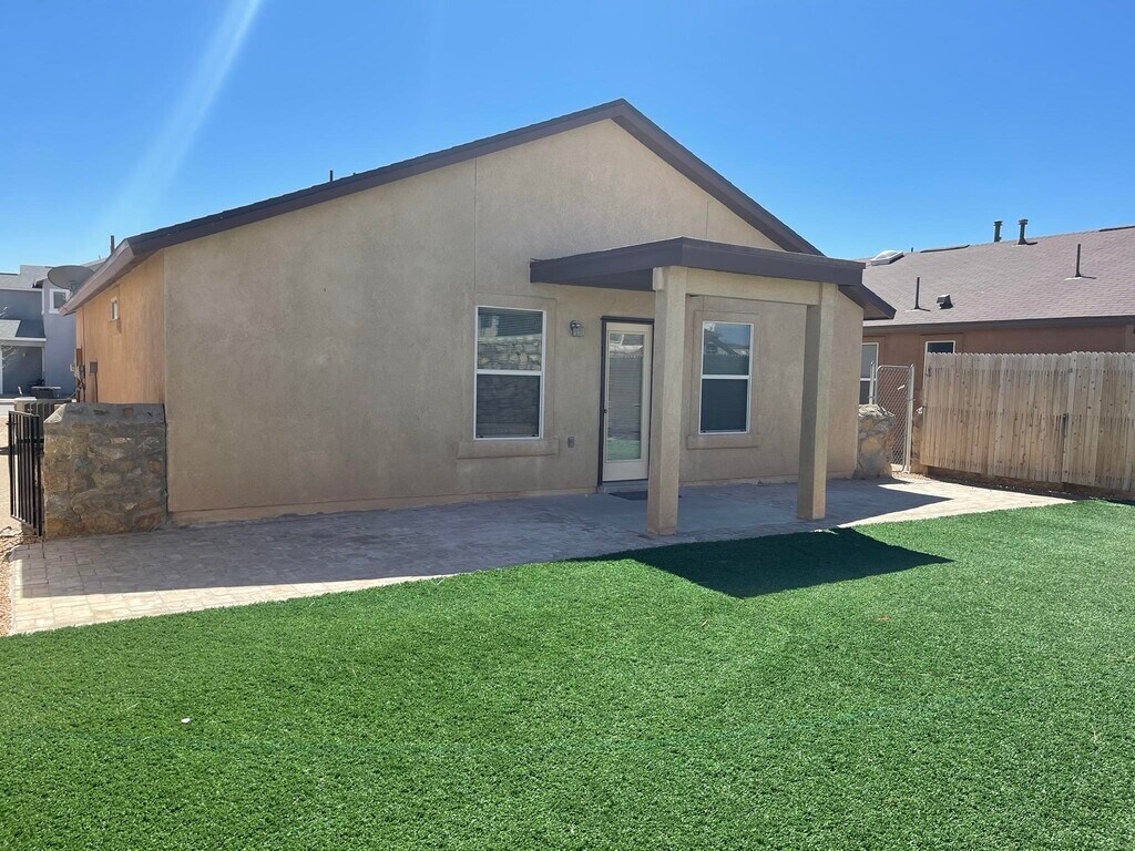 Home features refrigerated air with Terrazo tile in the living area and kitchen. The bedrooms have new recently installed carpet. Master bedroom has a good size walk in closet and its own full bath. In the backyard you will find artificial grass for ease and low maintenance landscaping. 30 Minutes from Ft Bliss and minutes away from I-10 and the new upcoming shopping center Eastlake Marketplace. Come view this comfortable low maintenance home