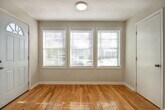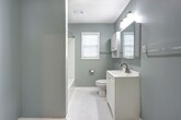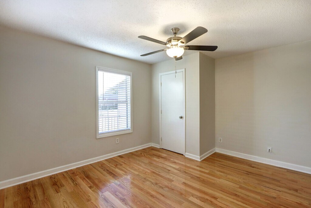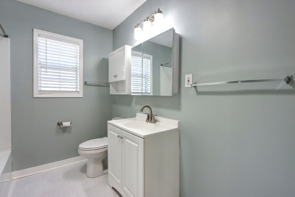 Three bedroom, two bathroom single family home with nice yard. The back bedroom has an en suite bathroom and the two bedrooms in the front of the house share a full bathroom.