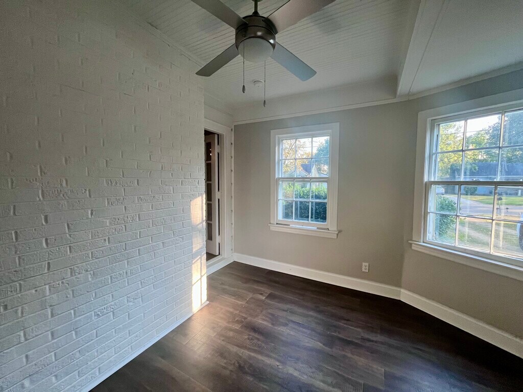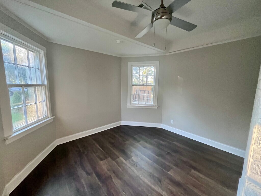 This freshly updated 2-bedroom, 1-bath cottage-style home blends vintage charm with modern updates in a quiet, established neighborhood. Featuring original hardwood floors, neutral interior paint, and updated lighting with ceiling fans throughout, the home also includes central heating and air for year-round comfort. The spacious living room offers a striking black fireplace mantle and abundant natural light, while an additional flex room provides perfect space for a home office, dining nook, or third bedroom. The kitchen features solid wood cabinetry with ample storage and a separate entrance. The bathroom includes updated fixtures, beadboard detailing, and a clean tub-shower combo. Laundry hookups are conveniently located in the hallway. Outside, enjoy craftsman-style shutters, a small front porch, a large yard, and a crushed gravel driveway for off-street parking. Rent is now $1200 with a matching deposit. Ask about our pet policies. Apply Now! Equal Housing Opportunity.