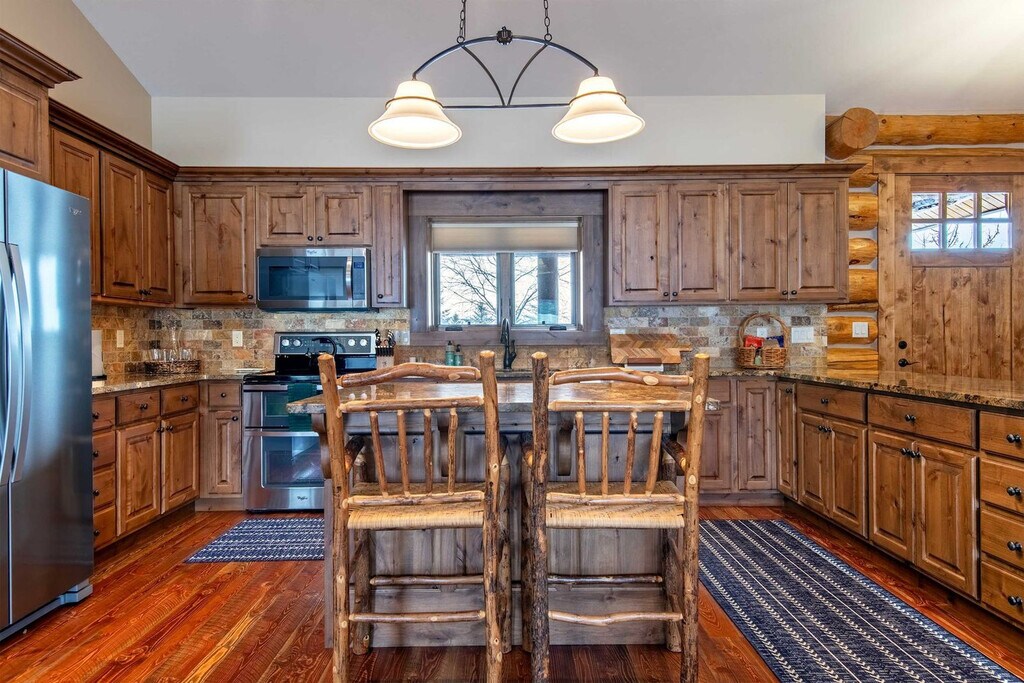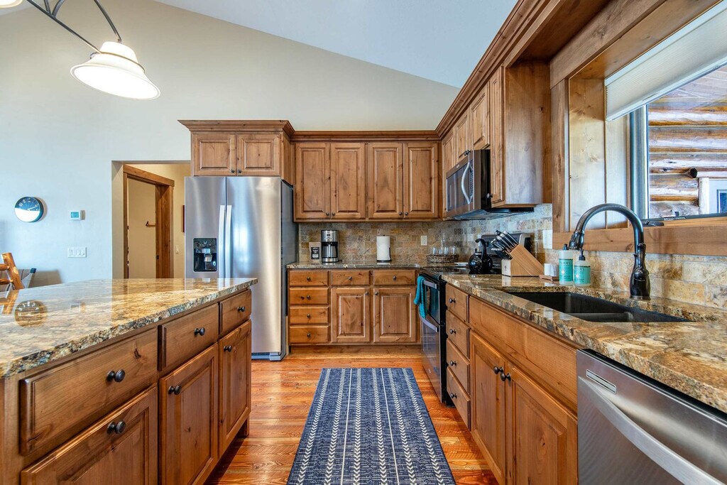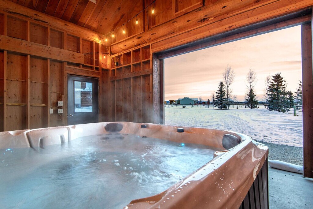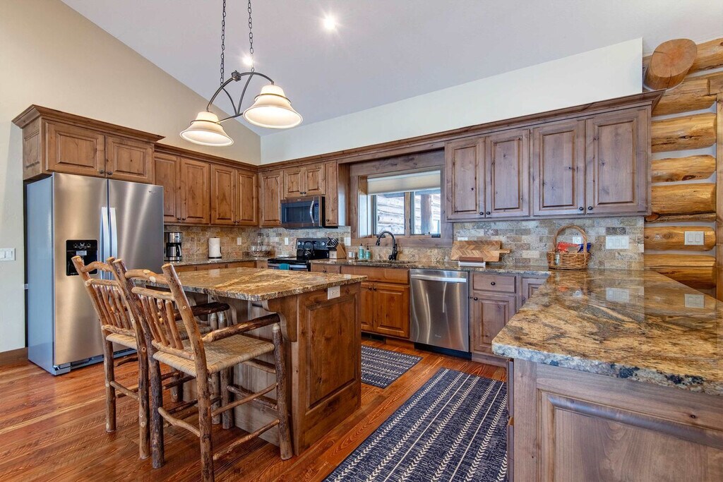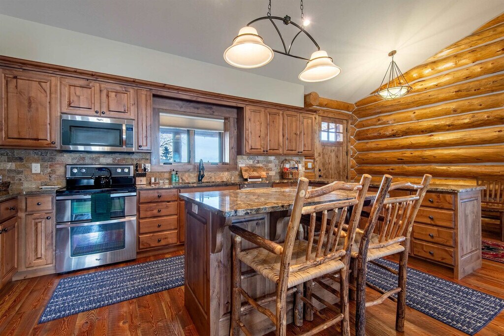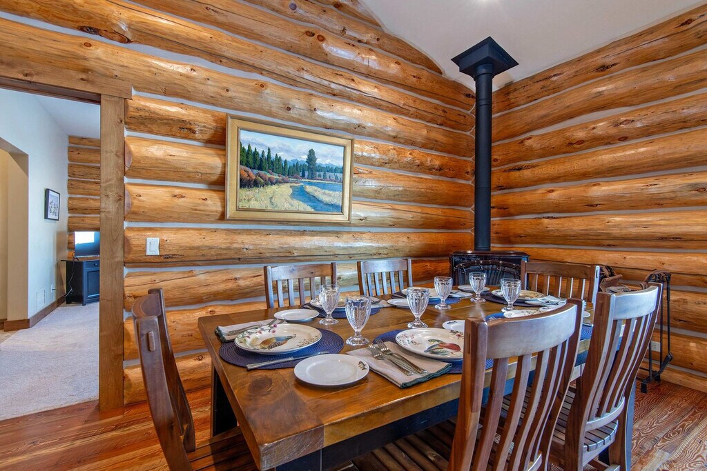 Feel at home in Darby Ranch Cabin, an authentic Western log home set just east of Driggs, Idaho. This 4-bedroom, 2-bathroom cabin blends handcrafted character, modern comfort, and an unbeatable location for mountain adventure. This log cabin features handcrafted log walls, vaulted ceilings, rich wood floors, and warm, inviting finishes throughout. The open-concept living space is anchored by a cozy wood stove. The fully equipped kitchen features rustic wood cabinetry, stone countertops, and a spacious island. A dedicated dining area invites long dinners and good conversation. A true highlight is the hot tub housed inside the pole barn, allowing you to soak in comfort while taking in sweeping views. Your relaxation comes first. The hot tub is fully drained, thoroughly cleaned, and refilled with fresh water before every guest's arrival. Located on Larsen Lane just outside central Driggs, this home offers a relaxed valley setting with convenient access to Grand Teton and Yellowstone. Grand Teton National Park’s Moose Entrance is 58 minutes (39 miles) away, and Yellowstone is reachable via the South Entrance in 2 hours 16 minutes (91 miles) or the West Entrance in 2 hours 3 minutes (101 miles). Grand Targhee Ski & Summer Resort is 27 minutes (13 miles) away, and Jackson Hole Mountain Resort is 53 minutes (35 miles). Jackson Hole Airport (JAC) is 1 hour 4 minutes (43 miles) away, Idaho Falls (IDA) is 1 hour 26 minutes (79 miles) away, and Bozeman (BZN) is 3 hours 43 minutes (190 miles) away. Driggs is 10 minutes away, Victor is 14 minutes away, and Jackson and Teton Village are about 51–54 minutes away. Nearby farmland, rivers, and trail systems support hiking, fishing, biking, and scenic sunsets beyond park boundaries. Quiet hours are from 9 pm to 8 am. No events are allowed, including parties, large gatherings, or weddings. Smoking or vaping is prohibited in the home or on the decks, and an additional charge will be applied if butts are found on the property. Fines will apply for violations including leaving garbage in the house or litter on the grounds, failure to disclose or clean up after pets, smoking in the house or garage, failure to follow house rules and respect posted signs, failure to follow check-out procedure, mistreatment of the hot tub, or violations of local laws. A minimum $500 fine will be applied for smoking, vaping, or marijuana use in the house or garage, violation of house rules, posted signs, or laws, or failure to vacate at check-out time. The number of people at the property should not exceed the maximum sleeping capacity. [SI]