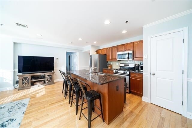 Located in the heart of Hoboken's most up and coming neighborhood, this gem is just few steps away from bustling life of the new Northwest Park, covered dog run, Trader Joe's, quaint shops, gourmet restaurants, and seasonal farmers market. Commuting is a breeze with the bus to NYC and the uptown ferry nearby, placing the best of the city within easy reach. The living space in this one bed plus den is adorned with an oversized bay window that bathes the room in enchanting afternoon light, creating an ambiance of warmth and welcome. The open concept design seamlessly connects the kitchen to a specious dining room and inviting breakfast bar, making it perfect for hosting gatherings that leave a lasting impresssion.