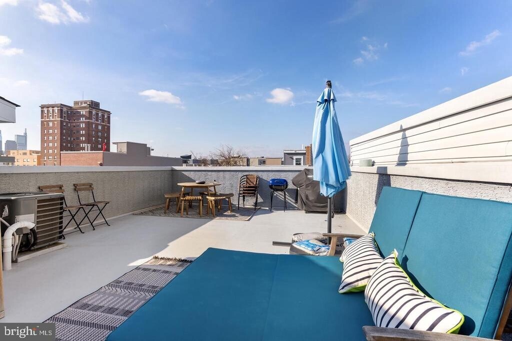 This 2-story exquisite condo. Open floor plan, hardwood floors, kitchen features high-end stainless steel Samsung appliances, sleek kitchen cabinets, induction cooktop, and white marble waterfall countertops. The large, west facing, windows in the living room allow the natural light to flow in radiantly throughout the space! Upstairs you will find two spacious bedroom, one of which features an en-suite bathroom. Off the second bedroom you will find your reading or quiet nook outside on the side patio. On the next level, you will walk out onto the massive rooftop deck to see breathtaking views of the city. This Philly gem is in close proximity to stores, restaurant, and easily accessible to public transportation.