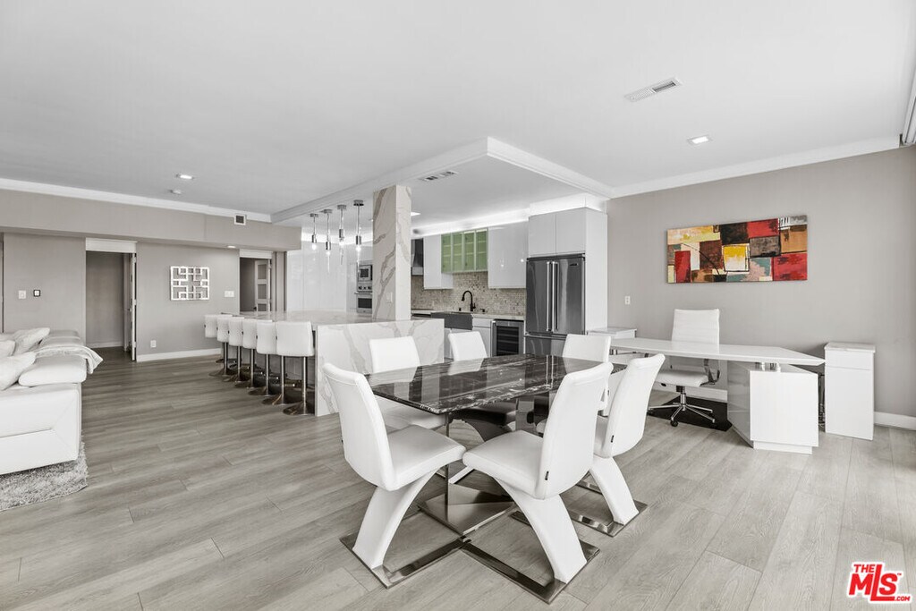 Discover urban luxury in this FULLY FURNISHED contemporary oasis, showcasing a striking blend of modern design and chic finishes. Perfectly located near Westwood Village and Century City, this condo has been remodeled from top to bottom. It is currently the largest 1 bedroom highrise condo for lease in the area boasting nearly 2,000 square feet with the city view balcony. The open concept living space is ideal for both everyday comfort and grand entertaining, with high ceilings that amplify its airy ambiance. The kitchen is a showstopper, featuring Viking appliances, quartz countertops, super high gloss white cabinets, and an island that comfortably seats six. A spacious L shaped white leather couch anchors the living area, perfectly positioned to enjoy the 85 inch Smart Sony TV while taking in the city views. Floor to ceiling sliding glass doors open to a large balcony illuminated by sleek LED lighting, offering a dramatic evening backdrop. The primary bedroom includes a generous walk in closet, and there is ample storage throughout, including hallway closets, a well appointed laundry room with cabinetry, and additional closets in the powder room. A dedicated office area occupies a bright, open corner of the living space, offering its own city view and a vantage point to see the living room, kitchen, and TV - a perfect spot for both work and leisure. This full service building provides 24/7/365 valet parking and security. If you're seeking luxury, location, and modern style in a full service high rise, this is your condo. Schedule a private showing today to experience it for yourself. MLS# 25623231