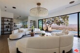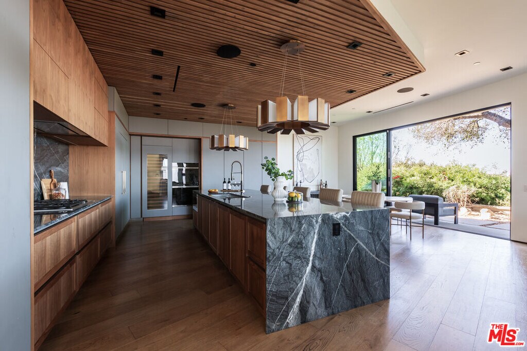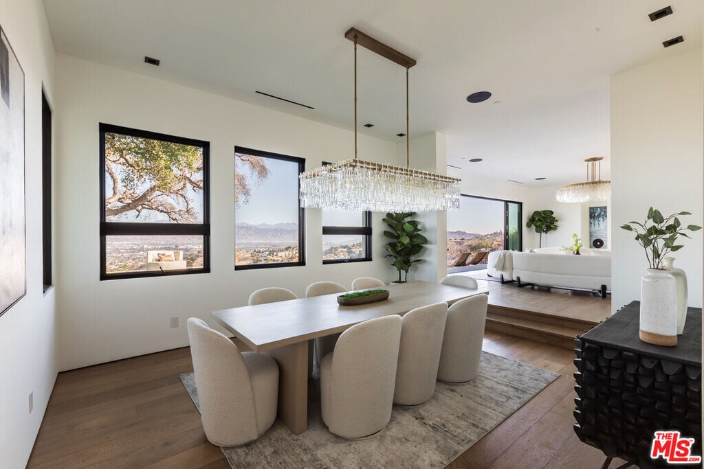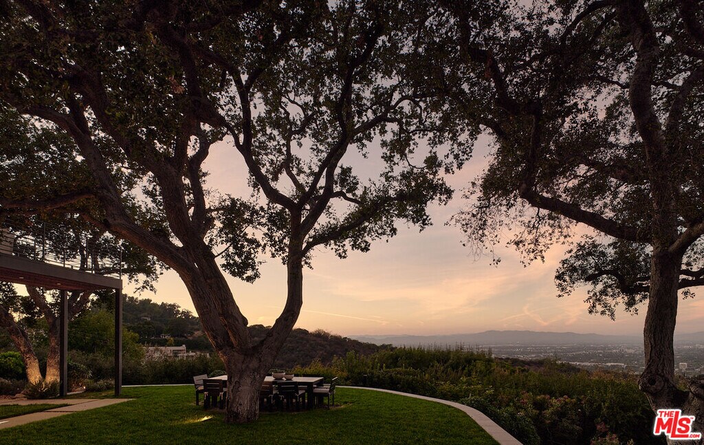 An unparalleled retreat offering uncompromising privacy along Mulholland Drive, you are transported into a one-of-a-kind, gated compound with breathtaking 220-degree views, ensuring seclusion, splendor, and exclusivity. Spanning nearly 7,000 sq ft, this home features 6 bedrooms, 6 bathrooms, and timeless sophistication. Upon arrival at the gated motor court, a striking waterfall greets you, accompanied by a double and single garage and additional parking for 5-6 vehicles. Entering through a dramatic pivot door, every room opens into expansive views. The main floor is designed for entertaining, offering formal and casual living spaces, a dining room, and an en-suite bedroom with European oak floors throughout. The kitchen embodies refined elegance, featuring bleached walnut and elephant grey paneling, Thermador and Wolf appliances, two dishwashers, a dual-zone wine fridge, and a spacious hidden walk-in pantry. The upper floor, accessible from east and west wing staircases, includes the sumptuous primary suite, 3 additional en-suite bedrooms, an office, and a laundry room. The nearly 1,000 sq ft primary suite boasts two expansive walnut-clad walk-in closets, a luxurious bathroom with leathered marble finishes, and a private living area with wrap-around balconies. The outdoor spaces are highlighted by an infinity pool, a large grassy al fresco dining area, and mature oak trees that frame the panoramic views, harmonizing the home with its natural surroundings. This residence epitomizes privacy, natural beauty, and impeccable design. MLS# 25572877
