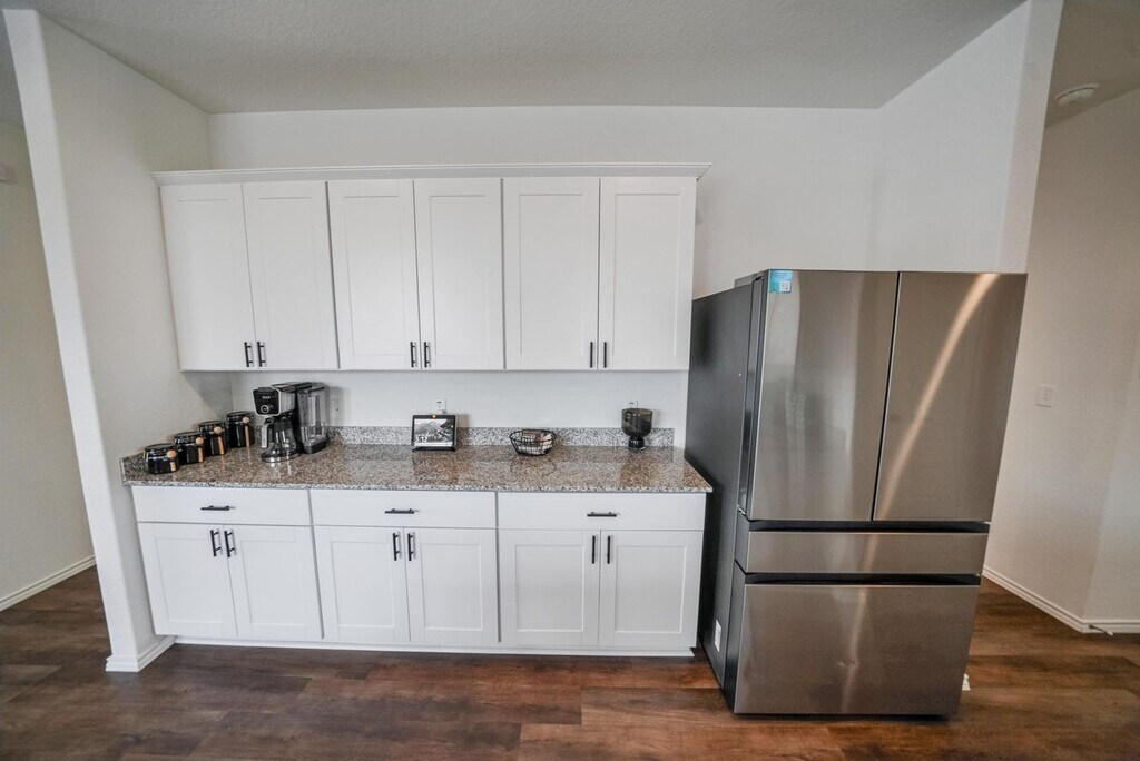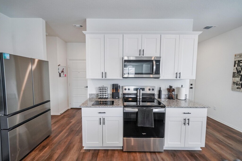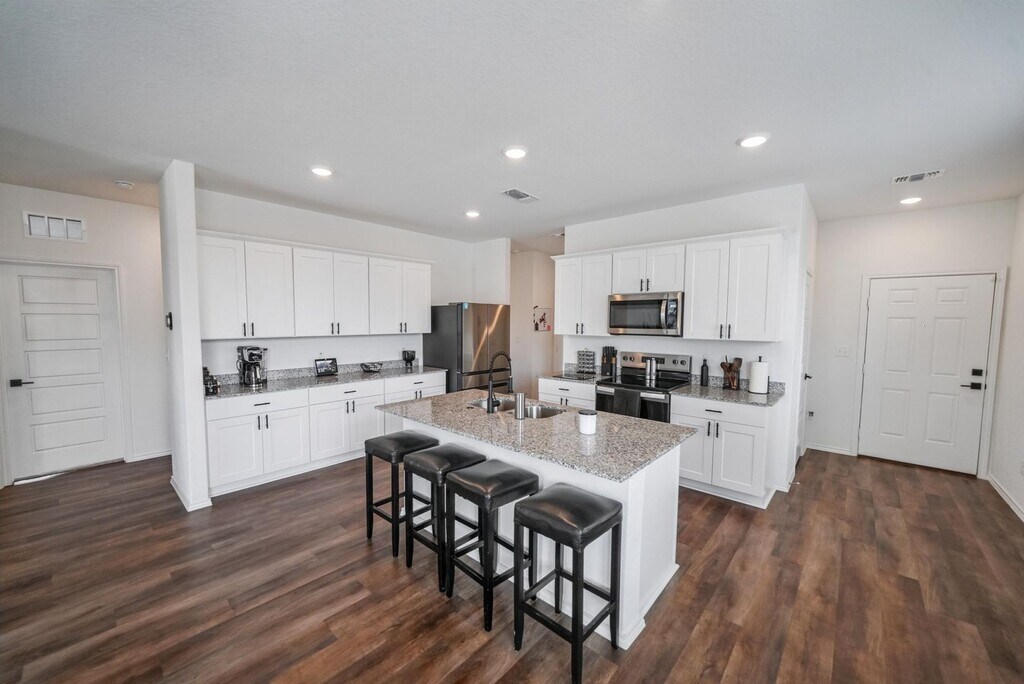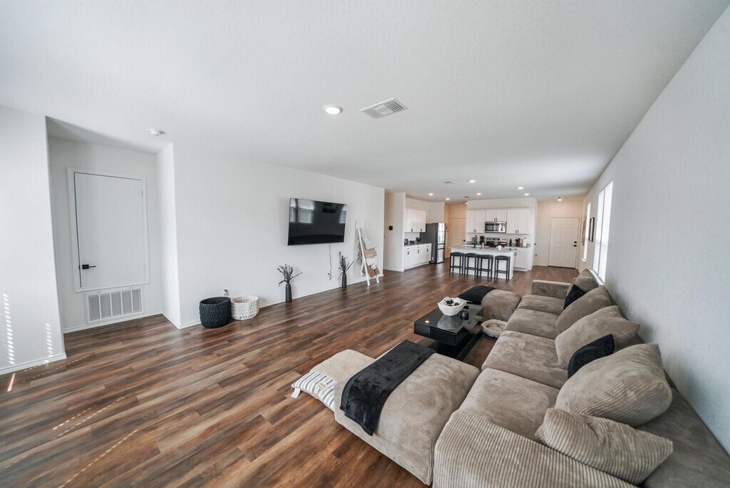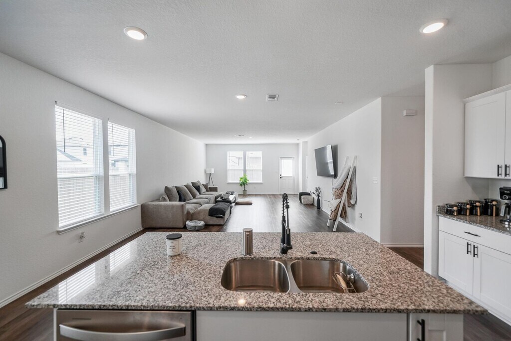 This nearly new single-story home offers 4 bedrooms and 2 bathrooms in the highly sought-after Vista Real subdivision. Step inside through the oversized entryway and into the open-concept living, dining, and kitchen areas, where stunning vinyl plank flooring and abundant natural light create a warm, inviting atmosphere. The spacious kitchen is designed with both style and functionality in mind, featuring granite countertops, upgraded shaker-style cabinets with custom pulls, a large island with an undermount sink, and matching stainless steel appliances. For added convenience, a refrigerator, washer, and dryer are included. The private master suite is thoughtfully separated from the secondary bedrooms and boasts a luxurious en-suite bathroom complete with dual vanities, a large walk-in shower, and a spacious walk-in closet. The three additional bedrooms are generously sized, providing plenty of space for family, guests, or a home office. With quick access to Loop 1604, Interstate 10, and just a short drive to Randolph AFB, this home offers both comfort and convenience. A true pleasure to show!