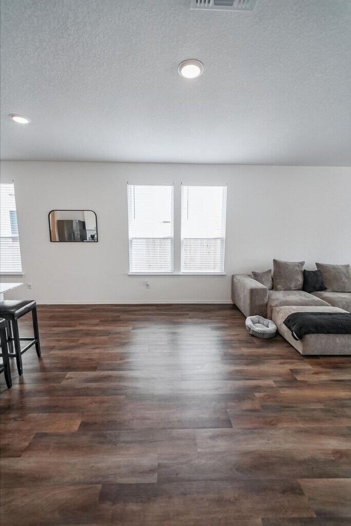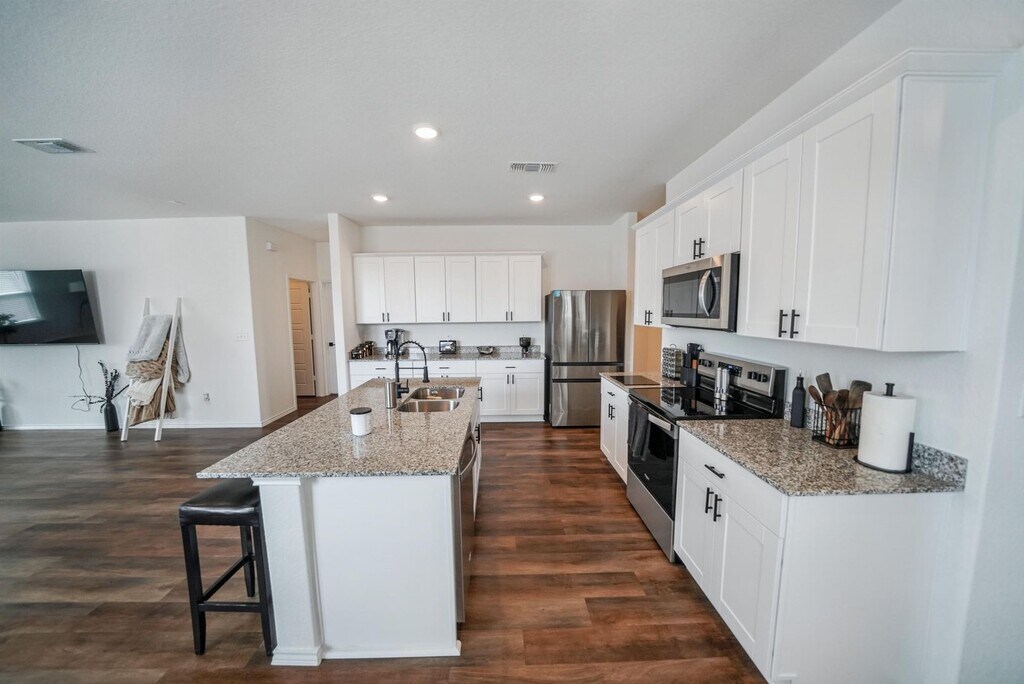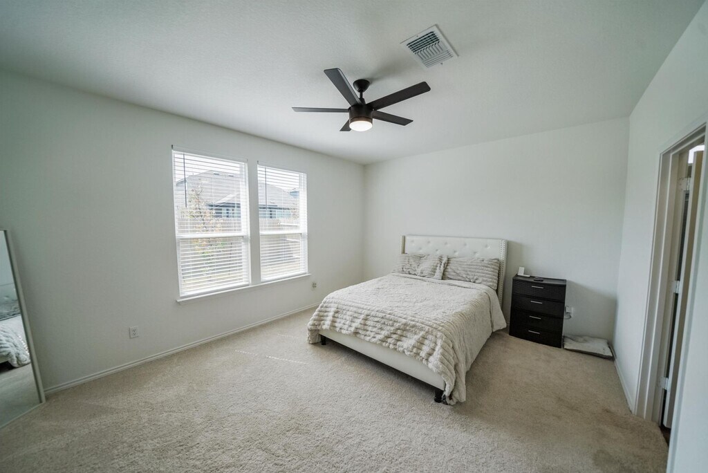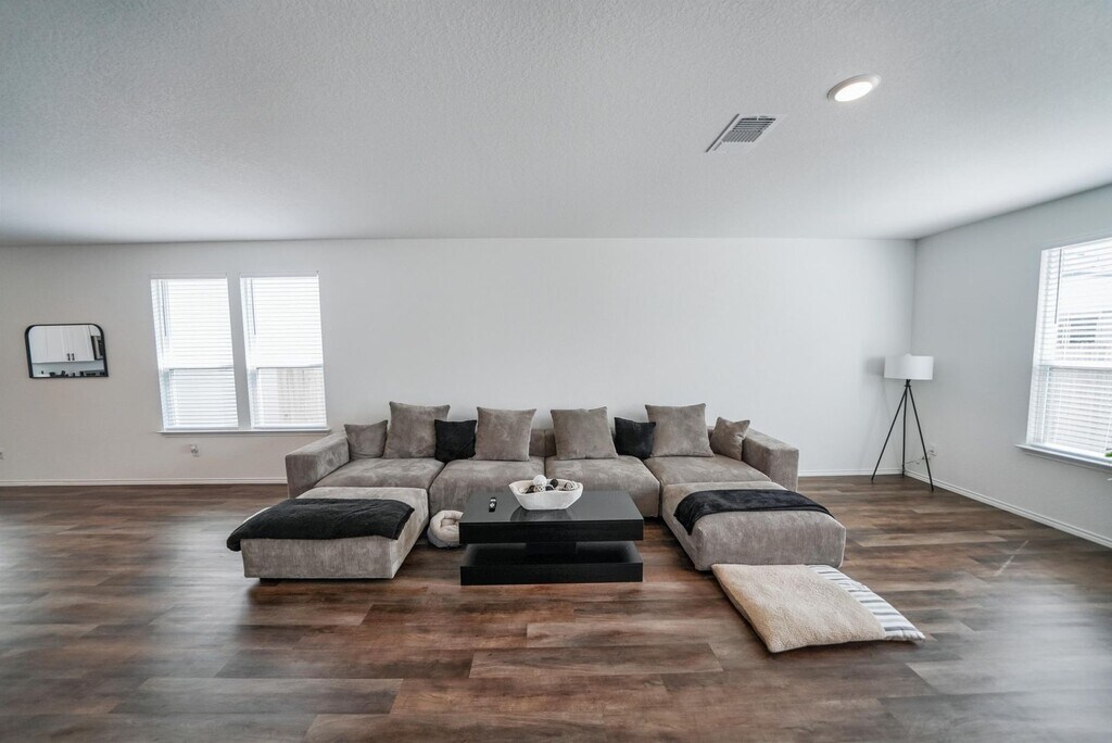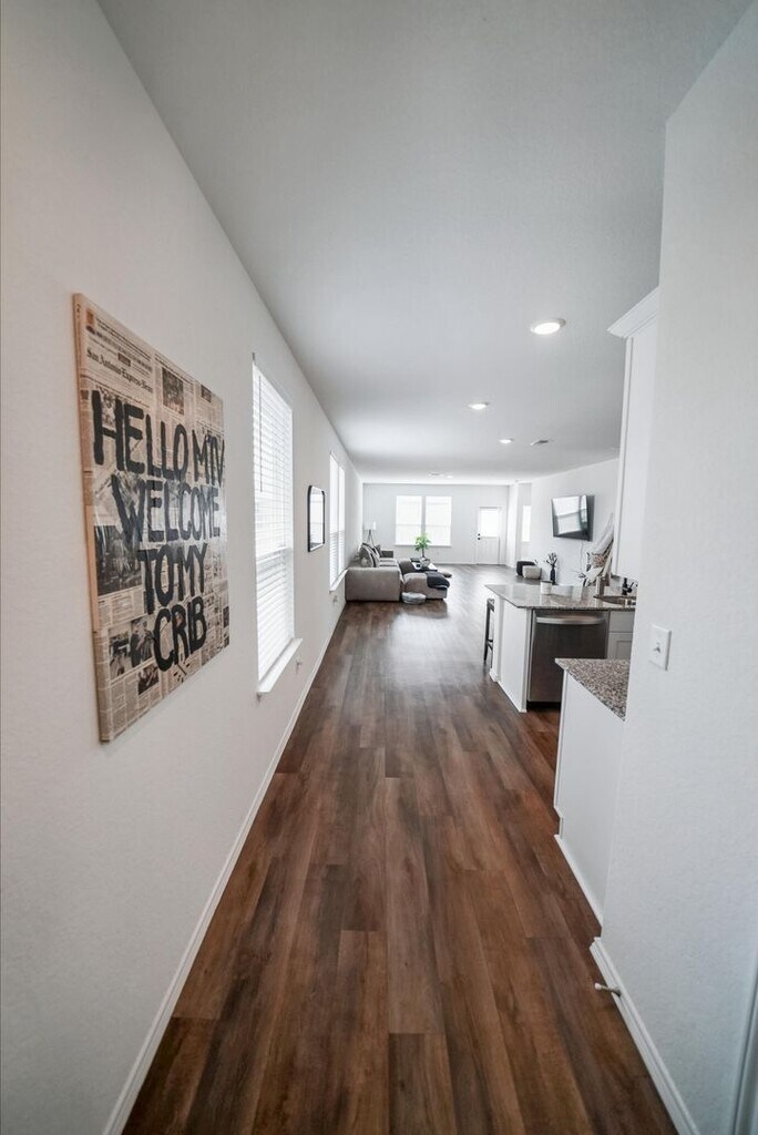 This nearly new single-story home offers 4 bedrooms and 2 bathrooms in the highly sought-after Vista Real subdivision. Step inside through the oversized entryway and into the open-concept living, dining, and kitchen areas, where stunning vinyl plank flooring and abundant natural light create a warm, inviting atmosphere. The spacious kitchen is designed with both style and functionality in mind, featuring granite countertops, upgraded shaker-style cabinets with custom pulls, a large island with an undermount sink, and matching stainless steel appliances. For added convenience, a refrigerator, washer, and dryer are included. The private master suite is thoughtfully separated from the secondary bedrooms and boasts a luxurious en-suite bathroom complete with dual vanities, a large walk-in shower, and a spacious walk-in closet. The three additional bedrooms are generously sized, providing plenty of space for family, guests, or a home office. With quick access to Loop 1604, Interstate 10, and just a short drive to Randolph AFB, this home offers both comfort and convenience. A true pleasure to show!