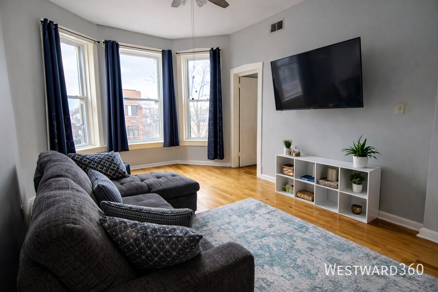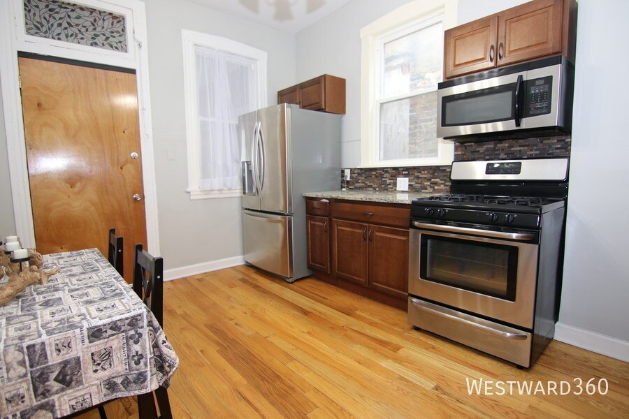 Beautiful sun-drenched 3-bedroom, 1-bath unit featuring 9.5’ ceilings and gleaming hardwood floors throughout. The recently updated kitchen offers granite countertops, maple cabinetry, stainless steel appliances including a dishwasher, and a spacious eat-in layout. Enjoy the convenience of in-unit laundry and central air for year-round comfort. The unit has been well maintained and delivers a clean, modern feel while still holding classic character. Pets are negotiable and the unit is available now for immediate move-in. Located in a secure, well-kept greystone building with a newer roof and attentive ownership. Set in the heart of Wicker Park, you’re surrounded by some of Chicago’s best restaurants, coffee shops, boutiques, and nightlife, all just steps from your door. Easy access to the Blue Line, major bus routes, and nearby parks makes commuting and day-to-day living effortless. This is true walkable city living in one of Chicago’s most sought-after neighborhoods. Daycare business on first floor.