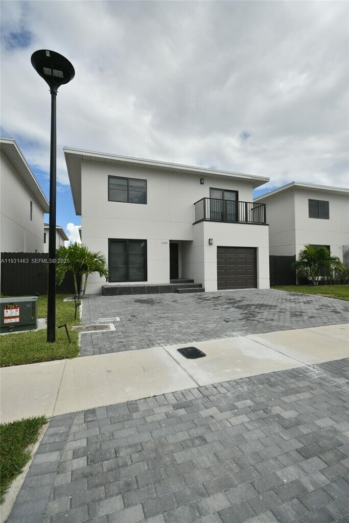 Built in 2024, this modern 2-story, with 5-bedroom, 3-bath single-family home in the sought-after Alba community offers comfort, durability, and flexible living. Built by ONX with a precision-engineered concrete build and impact windows & doors for added strength and storm resilience. The bright, open layout features a contemporary kitchen with quartz countertops, stainless steel appliances, ample storage, and automatic roller shades throughout. One bedroom and full bath on the first floor—ideal for guests or a home office—plus four generously sized bedrooms upstairs. Enjoy outdoor living with a private brick patio and newly installed lawn, perfect for relaxing or entertaining. Extended driveway accommodates up to 3 vehicles. Pet-friendly, move-in ready, and conveniently located near shopping, dining, and major access roads. Schedule your private showing today.