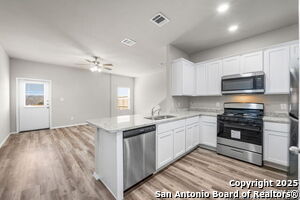 Almost new luxury duplex located in the desirable Hunters Ranch community in Northwest San Antonio near Castroville. This end-unit home offers added privacy and abundant natural light with a modern open-concept floor plan designed for comfortable living and entertaining. The kitchen features sleek stainless steel appliances including a refrigerator, gas range, microwave, and dishwasher, along with contemporary finishes and ample cabinet space. The spacious living and dining areas flow seamlessly, creating an inviting atmosphere. Upstairs, the home includes three generously sized bedrooms, two full bathrooms, and a convenient second-floor laundry area with washer and dryer hookups, eliminating the need to carry laundry between floors. The primary suite offers a well-appointed layout with ample closet space. Additional highlights include a private fenced backyard with a deck, ideal for relaxing or entertaining outdoors. Conveniently located with easy access to Loop 1604 and Highway 90, this property is just minutes from Alamo Ranch, shopping, dining, and major employment centers including Lackland AFB, UTSA, and the South Texas Medical Center. This move-in ready duplex combines modern design, functionality, and a prime location in one of the fastest-growing areas of San Antonio.