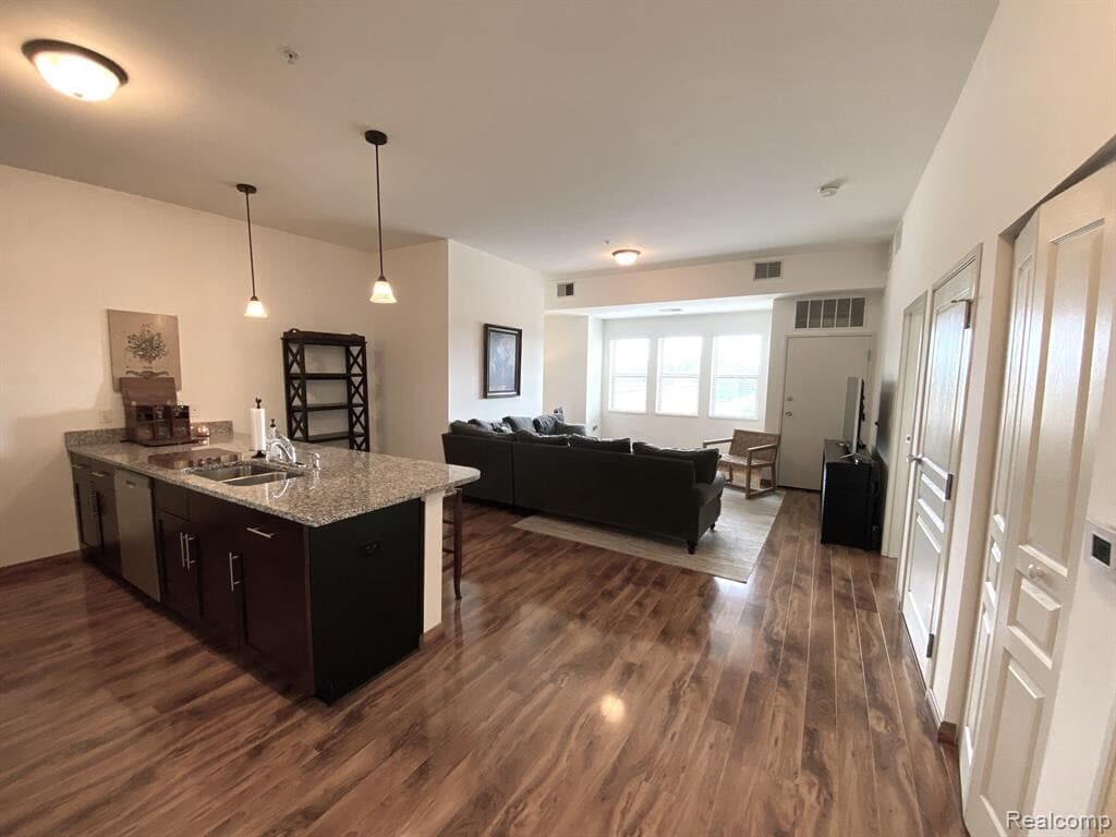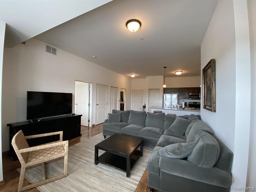 PENDING AT PRINT. Enjoy all that Downtown Fenton has to offer! Immediate occupancy in the Beautiful HIGH DEMAND Cornerstone Building!! This 4th Floor FULLY FURNISHED condo is a 1 Bedroom 1 Bath with views of everything downtown! Walking distance to restaurants, bars & parks. Gorgeous laminate floors throughout, Granite counters w/large breakfast bar & stainless-steel appliances. Tons of natural light with amazing views through the full wall of windows. Master Bedroom features a walk-through closet into the full bath. All appliances included. CALL FOR DETAILS ON IF THE CONDO IS UNFURNISHED. NO SMOKING, NO PETS.