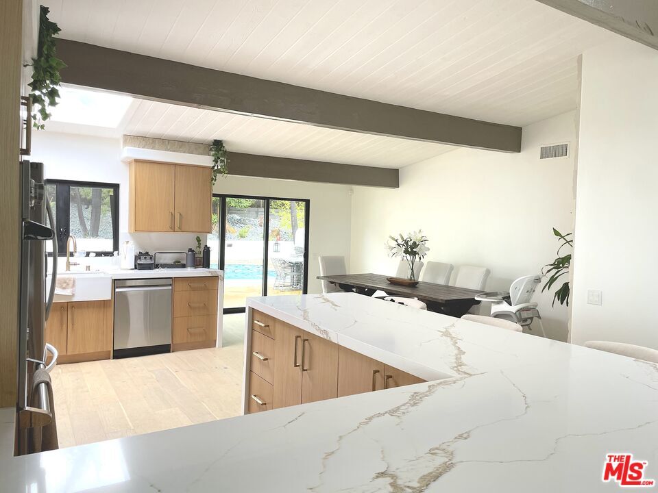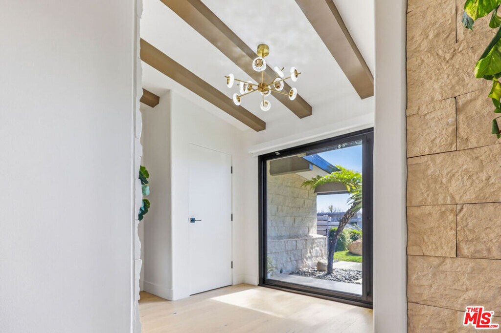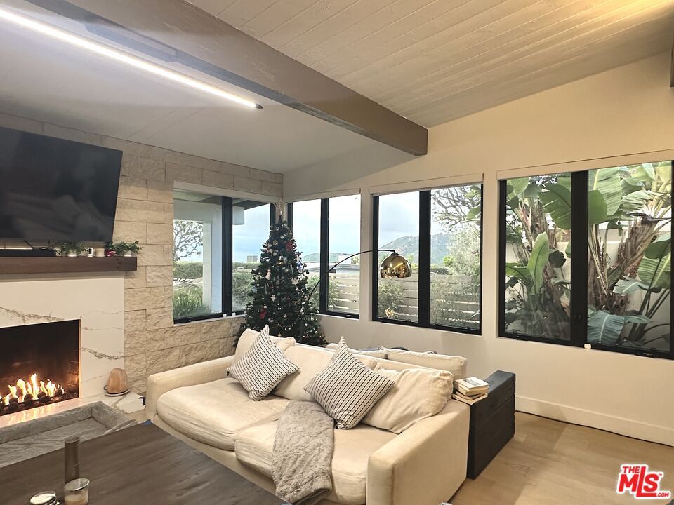 Perched at the top of prestigious Marquez Knolls on a quiet cul-de-sac in a highly regarded neighborhood, this fully renovated (August, 2023) mountaintop retreat sits on an 11,687SF lot and offers rare privacy, security, and sweeping ocean and mountain sunset views. This home, along with all other homes on the cul-de-sac, was not structurally damaged by the recent wildfires. This is more than a lease; it's a lifestyle upgrade. Elevated above the coastline, the home captures fresh ocean air, dramatic Pacific sunsets, and serene mountain surroundings. Designed for seamless indoor-outdoor California living, with high 10+ foot beamed ceilings and warm white oak wood floors that flow throughout light-filled interiors that open to expansive tropical front and rear yards. Multiple outdoor entertaining and workspace areas make it ideal for executives working remotely, families seeking space, or anyone looking to escape congestion while remaining minutes from the beach, hiking trails, and Lake Shrine. The fully gated property offers exceptional privacy and security, complete with a Ring alarm, doorbell camera, floodlight cameras, and monitoring system. Generous driveway and street parking provide added convenience for guests. Interior features include an en-suite primary suite complete with a spa-inspired wet room featuring dual rainfall showerheads, a soaking tub, heating fan, and integrated TV. Additional highlights include updated dual-pane aluminum casement windows and multi-slide doors, 40.5 square feet glass-iron pivot door, an in-line Thermador built-in espresso machine with fresh-ground capability, water filtration system with reverse osmosis and alkaline treatment supplying the pot filler and smart LG ThinQ refrigerator (with additional spherical craft ice maker), custom cabinetry and creative mines sanddollar exterior/interior stone features. The home also offers five LCD TVs throughout, a gas fireplace, automated shades, heated toilet seating with integrated bidet, wine rack, wine refrigerator, tankless hot water, Tesla EV charger, smart washer and dryer, smart dishwasher, and an additional refrigerator in the garage. Additional smart-home features include integrated lighting controls, Nest thermostat, Hyve irrigation system, landscape lighting, and an iAquaLink pool system. The pool and spa were recently replastered and upgraded with new LED color lighting, filtration systems, skimmer box and drains, further enhancing the home's resort-style appeal. The spacious yards provide ample room for children or pets to enjoy. **Listing Price is for Unfurnished. Fully furnished option available and includes all interior and exterior furnishings, a 6.5-foot vegetable garden, and a dedicated private home gym featuring a treadmill, TV, Olympic free weights, dumbbells, kettlebells, multi-functional adjustable weight bench with preacher curl and leg extension attachments, inversion table, and multi-functional adjustable weight bench, creating a turnkey wellness environment. Quiet. Secure. Elevated. This residence offers a rare combination of safety, luxury, and coastal mountain living. MLS# 26655005