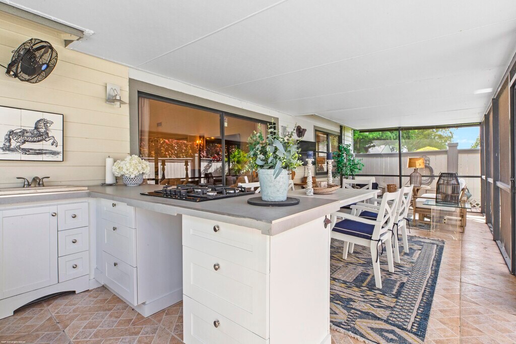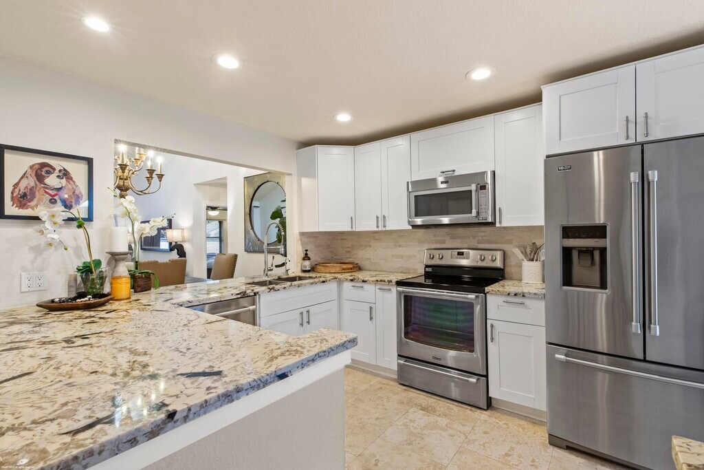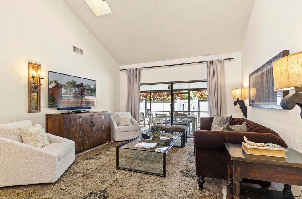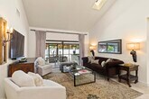 Beautifully furnished 3BR/2Bth end unit townhome with 1-car garage, updated kitchen & bathrooms. This unit boasts a beautifully landscaped front courtyard with terracotta tile, plus a covered & screened rear patio with bar counter and cooktop. Enjoy the community pool and being close to all the competition venues!