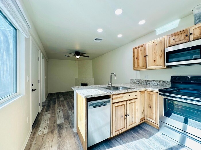 Available Now! Welcome to our newly renovated 2-bedroom, 1-bathroom townhome in the heart of Tucson, AZ. This charming unit features vaulted ceilings, natural light, and a front private porch perfect for enjoying the beautiful Arizona weather. The kitchen boasts stainless steel appliances, granite countertops, wood cabinets, and a dishwasher for easy clean-up. The tiled shower and hard flooring throughout add a touch of luxury to this cozy space. With central air conditioning, a fireplace, and off-street parking, this townhome has everything you need for comfortable living. Washer/dryer in unit! Don't miss out on this opportunity to call this townhome your new home! Only 10 townhomes in this community! Community exterior will be painted within the next couple months. Bathroom mirror being installed this week. Pets welcome with additional pet fee and monthly pet rent. Renters insurance is required All utilities are tenants responsibility. Contact Chris text or phone at to set up a tour or answer any questions. (mention address and unit) Apply online at Equal Housing Opportunity. Fort Lowell Realty & Property Management. This property allows self guided viewing without an appointment. Contact for details.