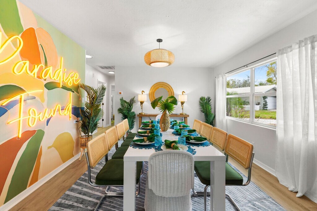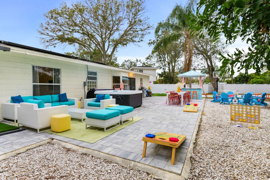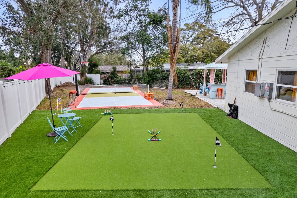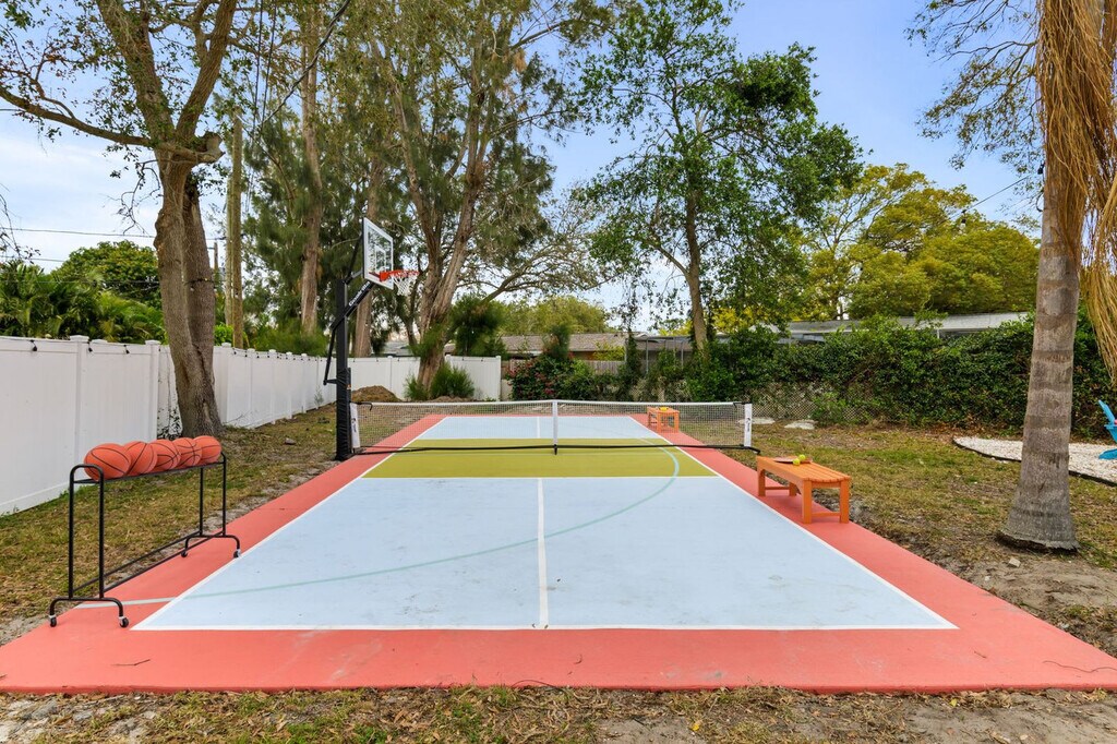 This 5-bedroom house in Seminole, FL, is packed with amenities and has everything you need for an amazing vacation. Feel at home with features like a heated private pool, sportscourt for basketball and pickleball, outdoor bar, hot tub, fire pit, outdoor patio and dining area, BBQ grill, and more. The house comfortably accommodates up to 18 guests, making it perfect for reunions, celebrations, or relaxing with loved ones. The house offers 5 spacious bedrooms and 2.5 bathrooms, ensuring comfort for all guests. Each bedroom is equipped with a smart TV, and the fully stocked kitchen boasts high-end stainless appliances, a large refrigerator, and ample cooking space. The living room features a 65" smart TV and direct outdoor access, while the spectacular resort-style backyard includes a heated private pool, sportscourt, outdoor bar, hot tub, fire pit, and ample outdoor seating. The heated private pool is available for $100 per night and can be heated to about 20-25 degrees above the ambient temperature. It is recommended to heat the pool between October and May, with a 3-day notice required before arrival. Parking is available for up to 3 cars. Explore the area with ease, whether by renting a car or using rideshare services like Uber and Lyft. Nearby attractions include Boca Ciega Millennium Park, Lake Seminole Park, Florida Botanical Gardens, and Treasure Island Fun Center. For dining, visit local favorites like Mamas Kitchen, Zom Hee Chinese Restaurant, Jimmy's Sushi, Doc Ford's Rum Bar and Grille, and Mad Beach Cantina. Check-in is at 4pm and check-out is at 10am. The primary guest must be at least 25 years old, and no pets or parties are allowed. Violations may result in immediate termination of the stay. An exterior camera is installed to monitor the cleaning team for quality and security purposes. Guests must be 21 years or older to book this property. A guest verification process is required within 48 hours of booking confirmation, and a rental agreement must be signed prior to check-in. A non-refundable $60 damage waiver is required, covering accidental damage during your stay, provided it is reported before check-out. The house includes a dedicated workspace, providing a comfortable environment for remote work. [SI]