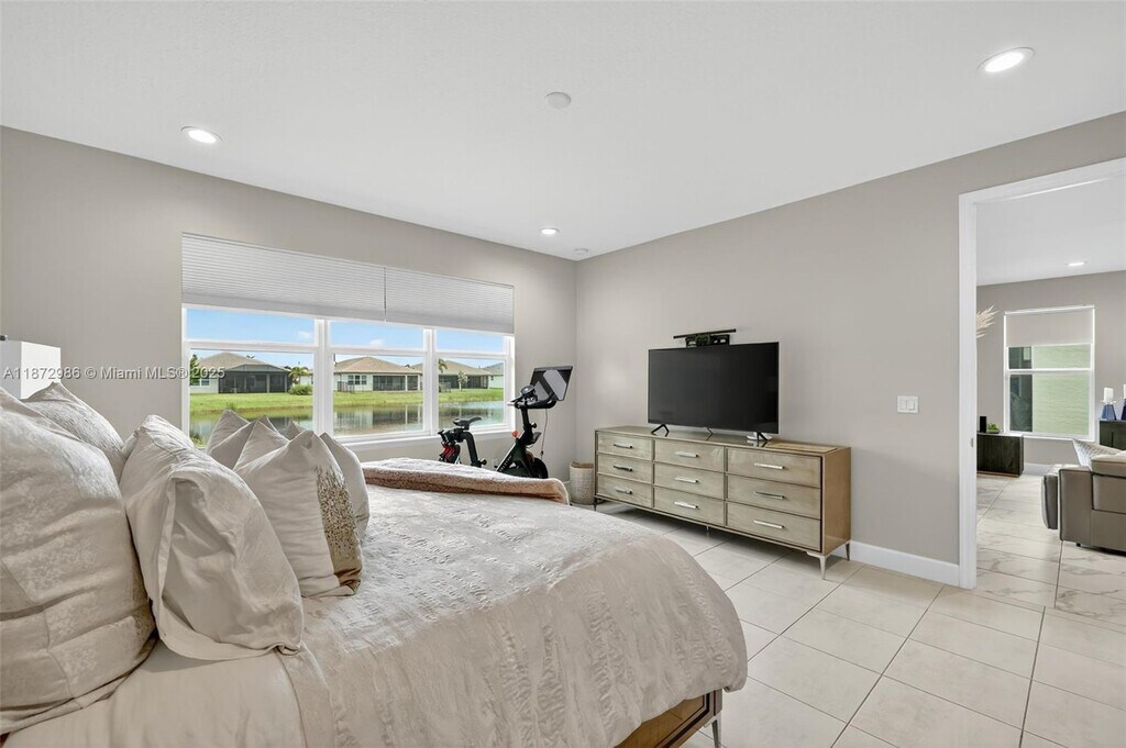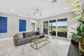Stunning Marsala model with water views, filled with natural light! This home features crown molding, custom draperies, designer wallpaper, and high-quality porcelain tile throughout (no carpet). The bright white kitchen features a built-in pantry and high-end finishes. Both bathrooms are beautifully appointed, with art-inspired lighting and designer touches that extend throughout the living room. French doors lead to the office, while large windows frame the serene water views, creating a bright, stylish, and inviting home. It also includes a large storage room and a versatile den. Come visit this beautiful home and make it yours today! It's time to enjoy the Riverland lifestyle!