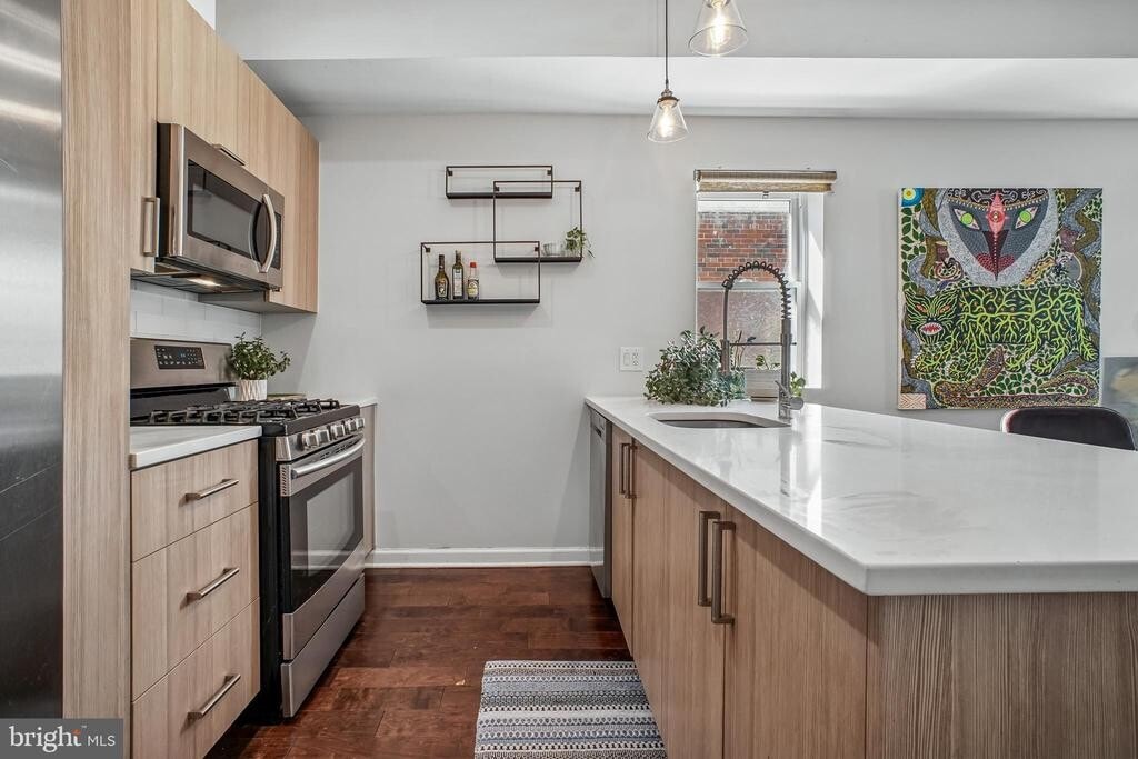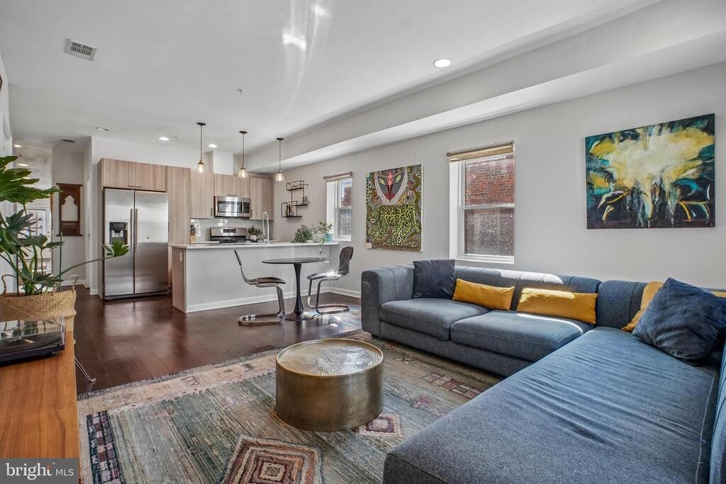 This stunning 2 BR 2 BA top-floor residence at The Nicholson features an expansive open-concept floor plan characterized by soaring high ceilings and oversized windows that flood the home with natural light. The gourmet kitchen is a chef’s dream, boasting white quartz countertops, a large breakfast bar, designer subway tile, and premium stainless steel appliances. Relax in the spacious primary suite, complete with a walk-in closet and a luxury ensuite bath featuring high-end finishes. Hardwood floors throughout, recessed lighting, and an in-unit washer/dryer add to the comfort of this home. Includes assigned off-street parking and your own rooftop Porch. Ideally located on a quiet, tree-lined street just blocks from Rock Creek Park, local cafes, and easy bus routes to the Takoma and Fort Totten Metro stations.